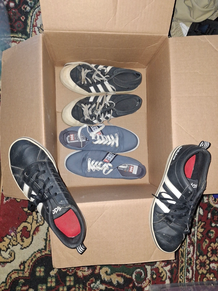Selling a mix of Adidas and Helly Hansen shoes. 9 1/2 & 8 1/2 sizes, very worn, ask me anything. $5 a pair! will deliver from princess ave, prices are firm!