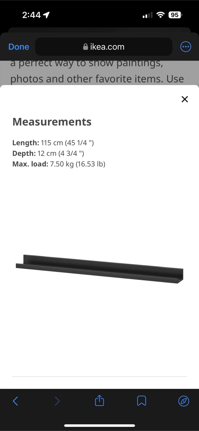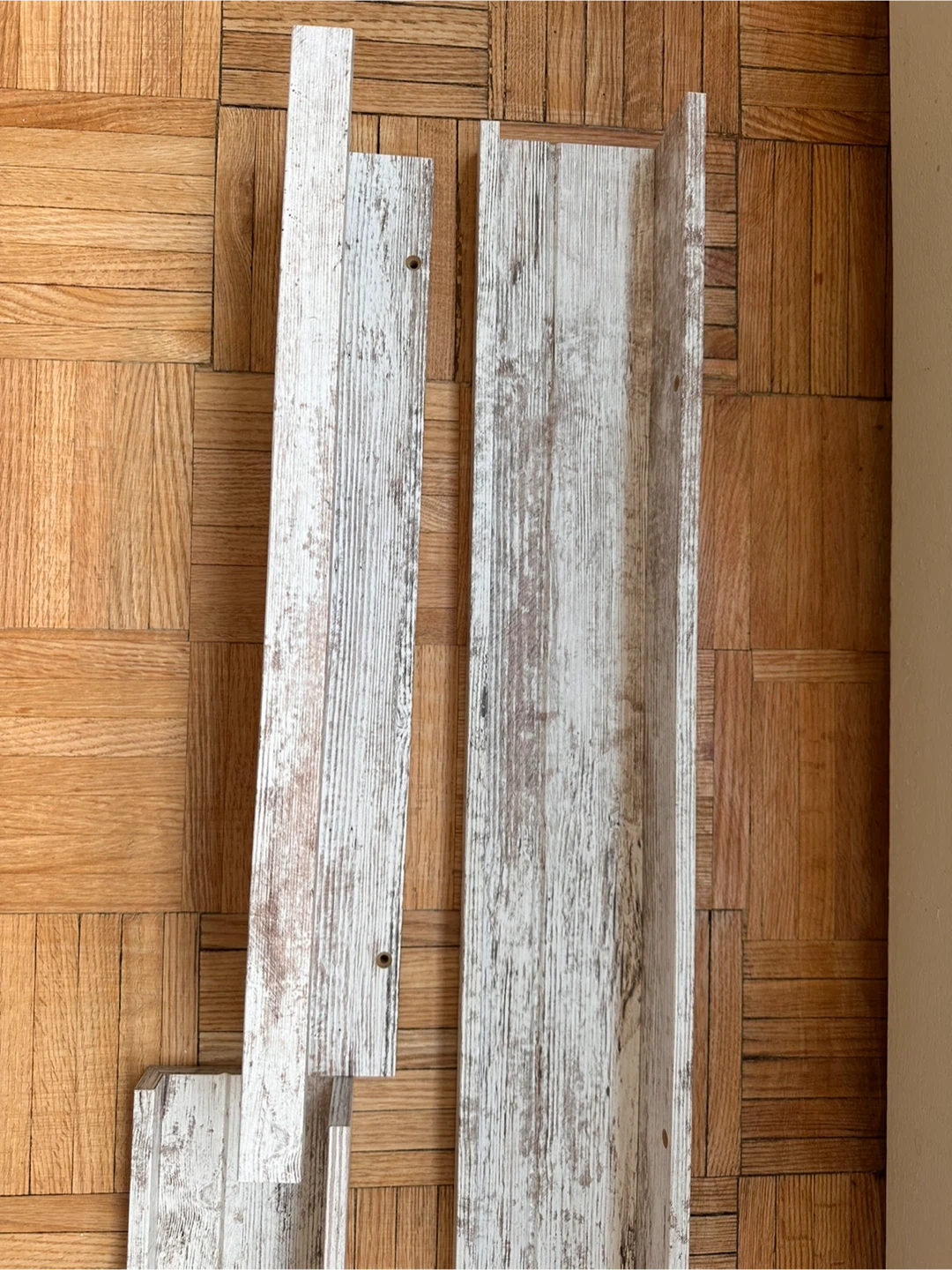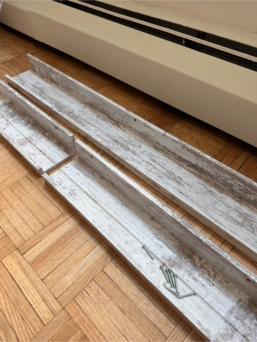 Selling a set of 3 Ikea Mosslanda picture ledges in a white, slightly rustic distressed wood finish. In great condition They're perfect for displaying photos, artwork, or small decorative items. Measurements are in the image. Selling all three together + giving screws for them as well! Pick up near Yonge and Bloor