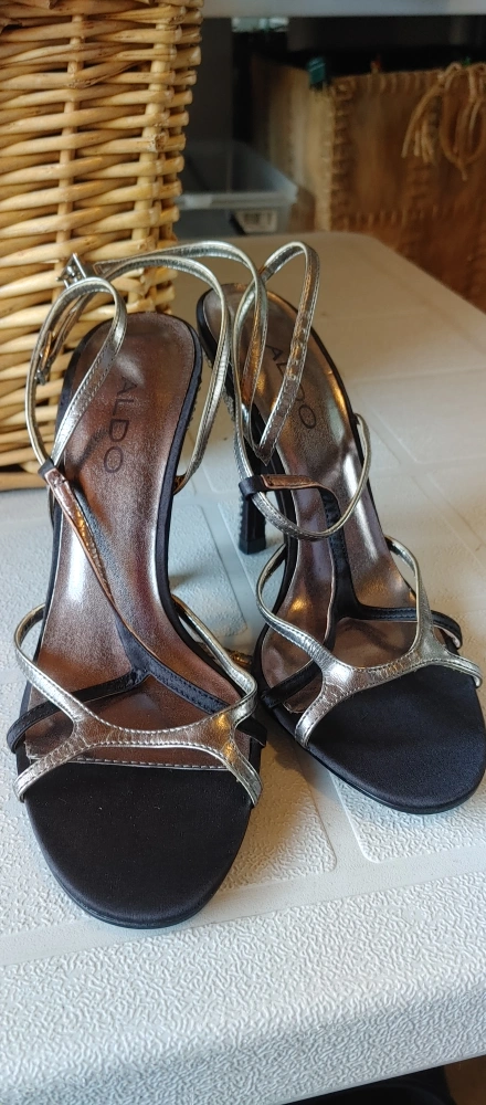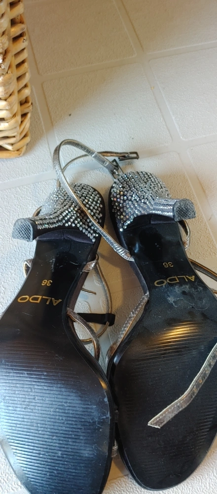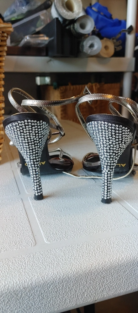 Selling a pair of ALDO heels in size 6. They are silver and black with rhinestone detail on the heel. Great for a night out!