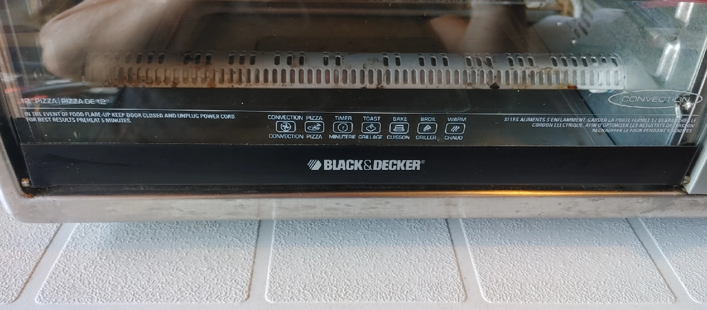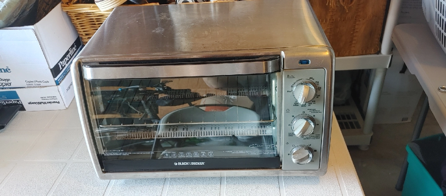 Selling a Black & Decker convection toaster oven. It has settings for convection pizza, timer, toast, bake, broil, and warm. It can fit a 12" pizza.