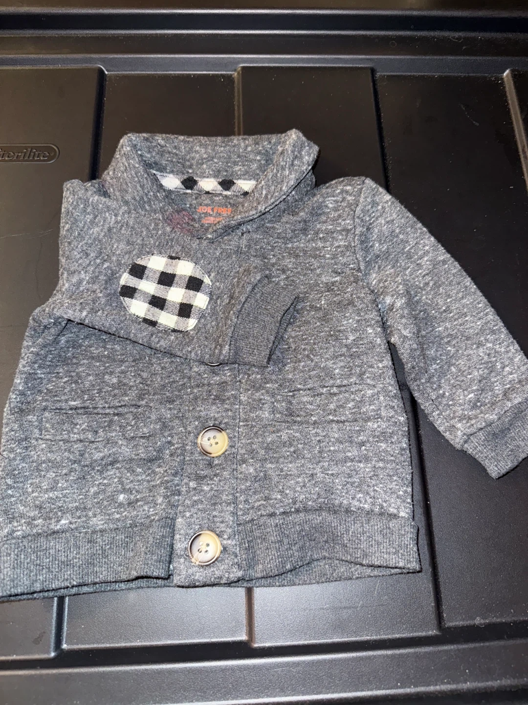 A cute grey cardigan from Joe Fresh for your little one! The cardigan features a stylish button-up design and a charming checkered patch detail. It's perfect for layering to keep your baby cozy and fashionable.