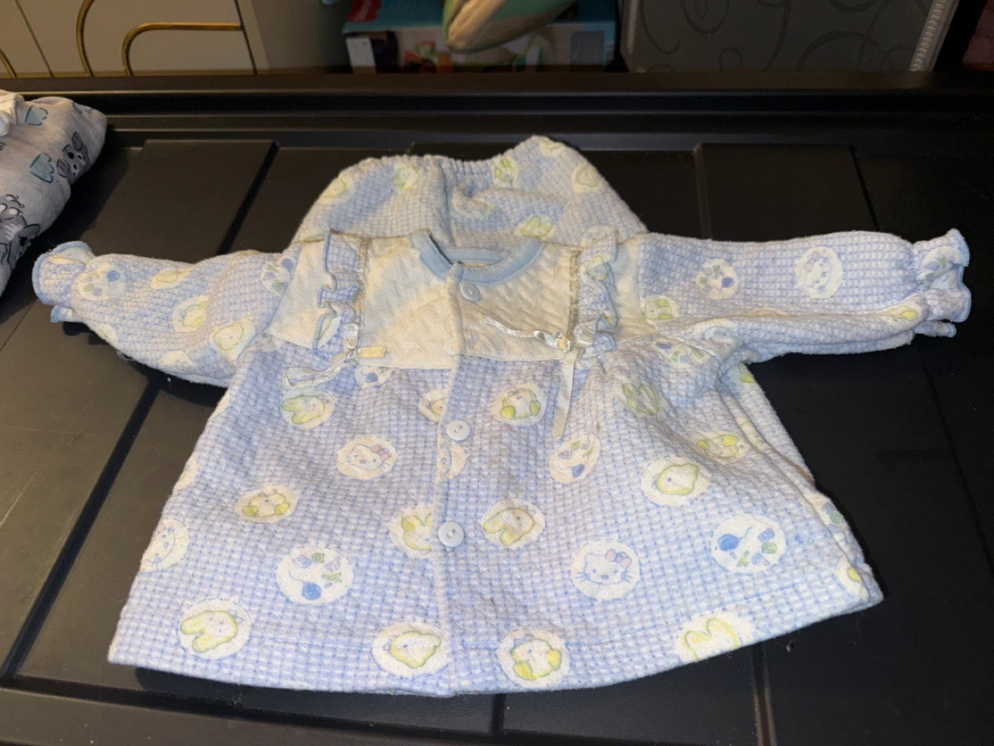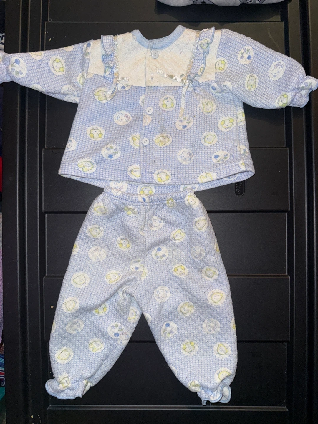 A cute baby pajama set in a light blue colour with a sweet animal pattern. Perfect for keeping your little one cozy and comfortable during sleep. The set includes a top and pants, both in great condition.
