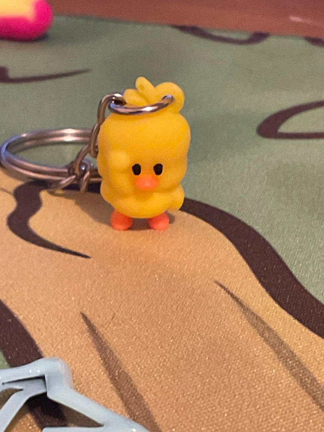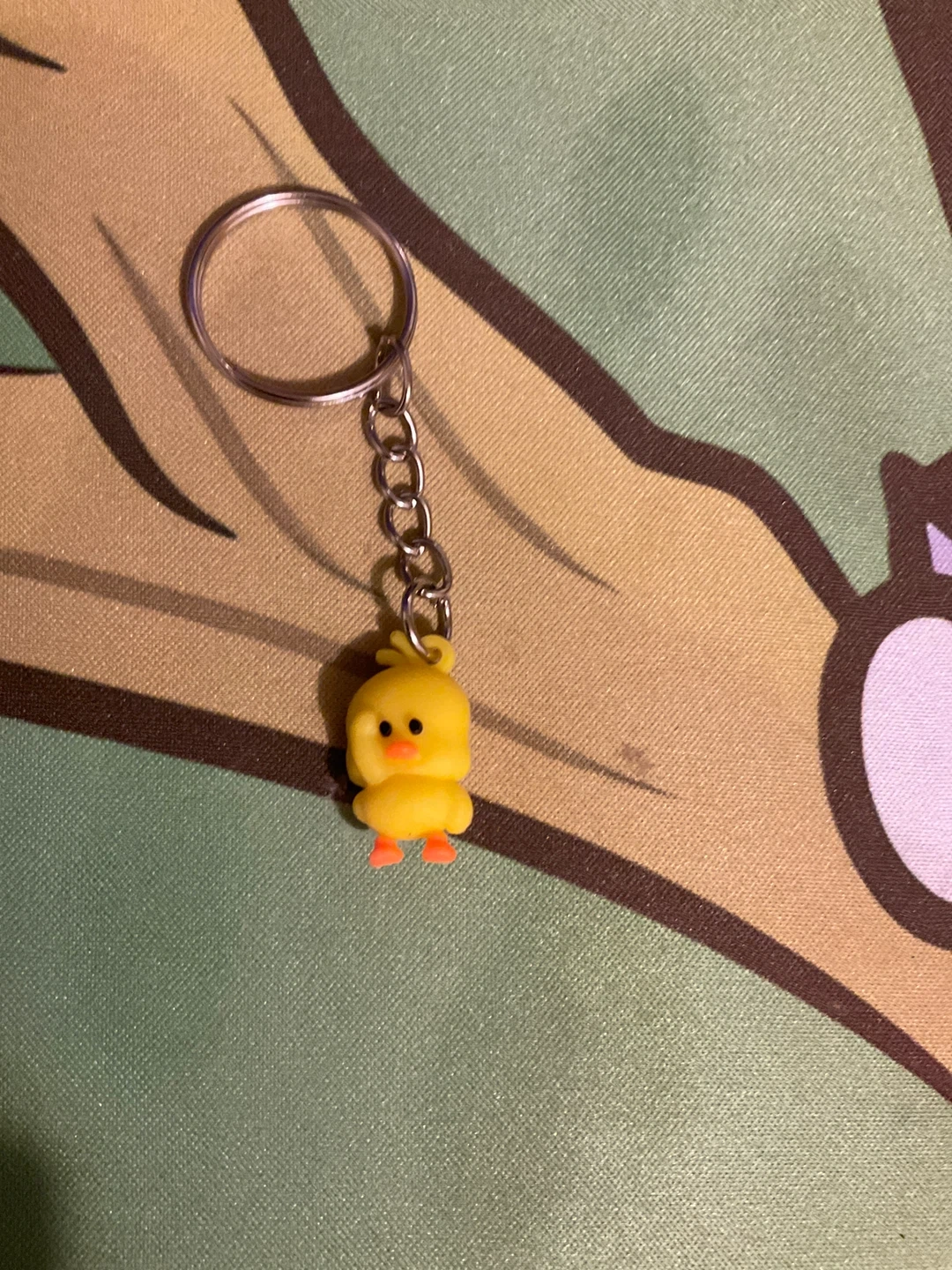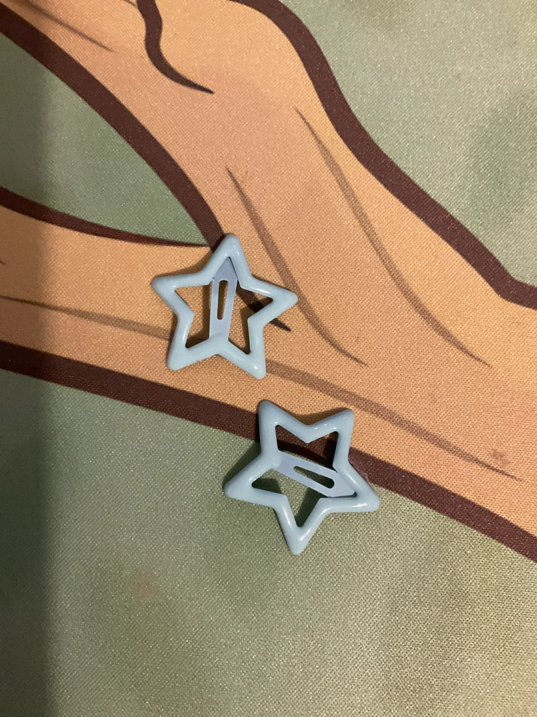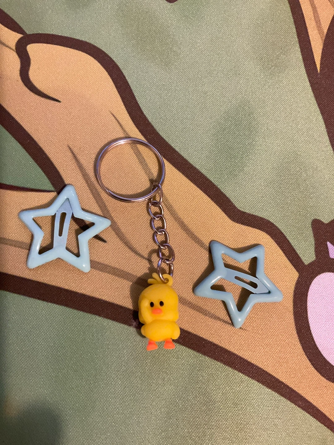 I'm selling a super cute yellow chick keychain! It's in great condition and ready to add some charm to your keys or bag. I'm also including two light blue star-shaped hair clips. They're perfect for adding a little sparkle to your hair!