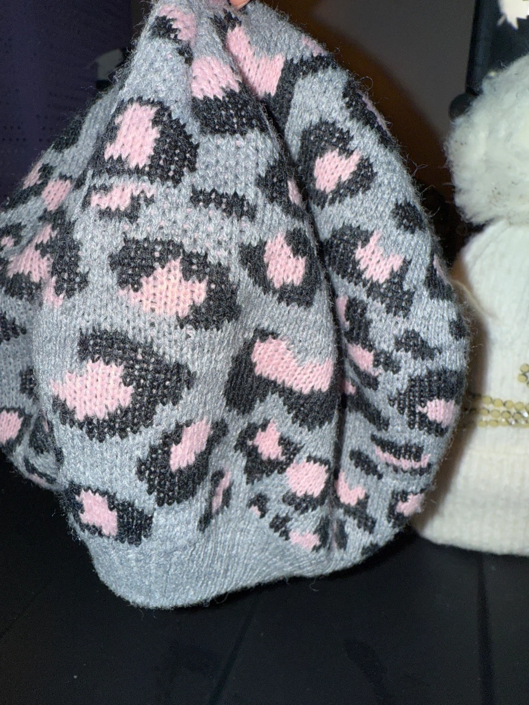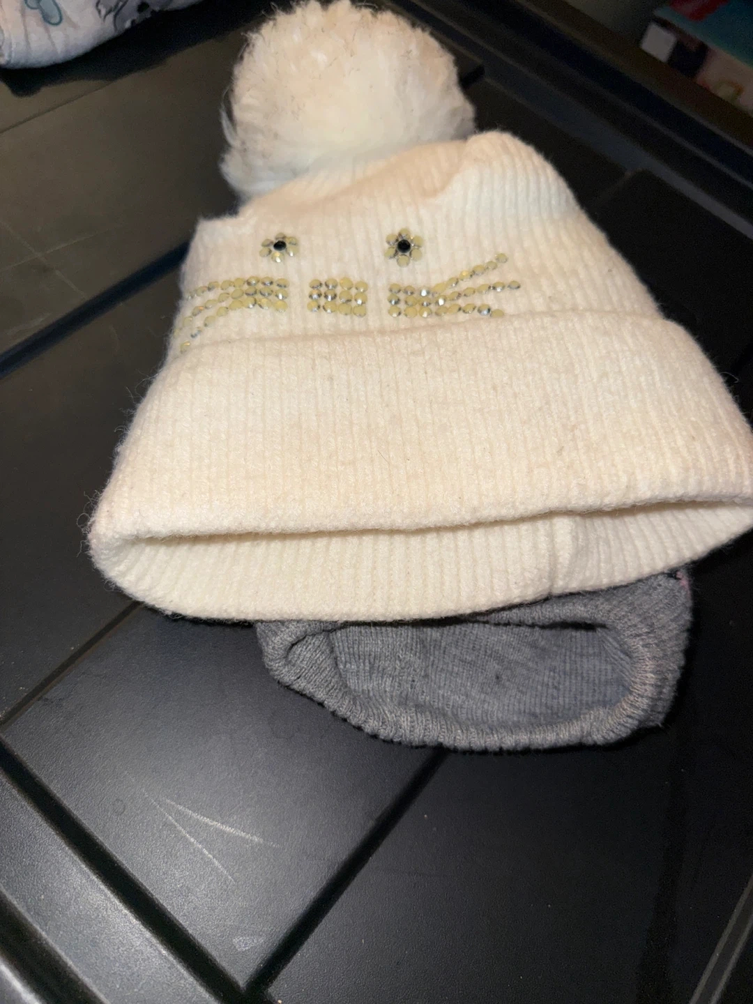 Selling a bundle of kids' winter hats! Includes a white cat-themed hat with a pompom, a grey and pink leopard print hat, and a blue sequined hat. All in good condition and ready to keep your little one warm this winter
