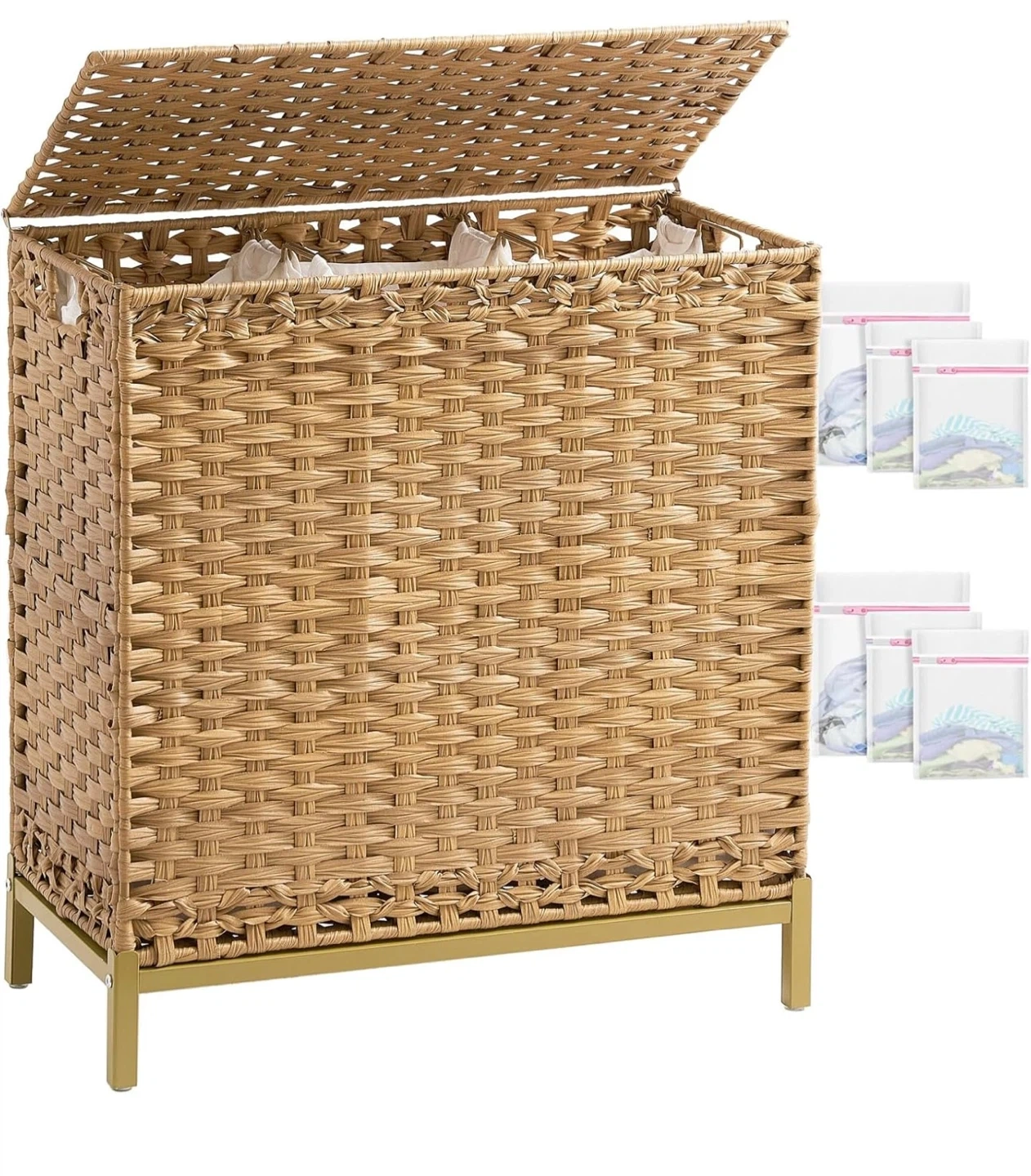 This woven hamper comes with 3 separate detachable liner bags, designed for sorting and storing clothes. It features easy-to-carry side handles, user-friendly handles, and a waterproof elevated metal base. The hamper is made of breathable rattan material. Dimensions are 66cm/26" wide, 33cm/13" deep, and 71.1cm/28" high. Maximum capacity is 132L/34.9Gal, and it can hold a maximum load of 110LB/50KG