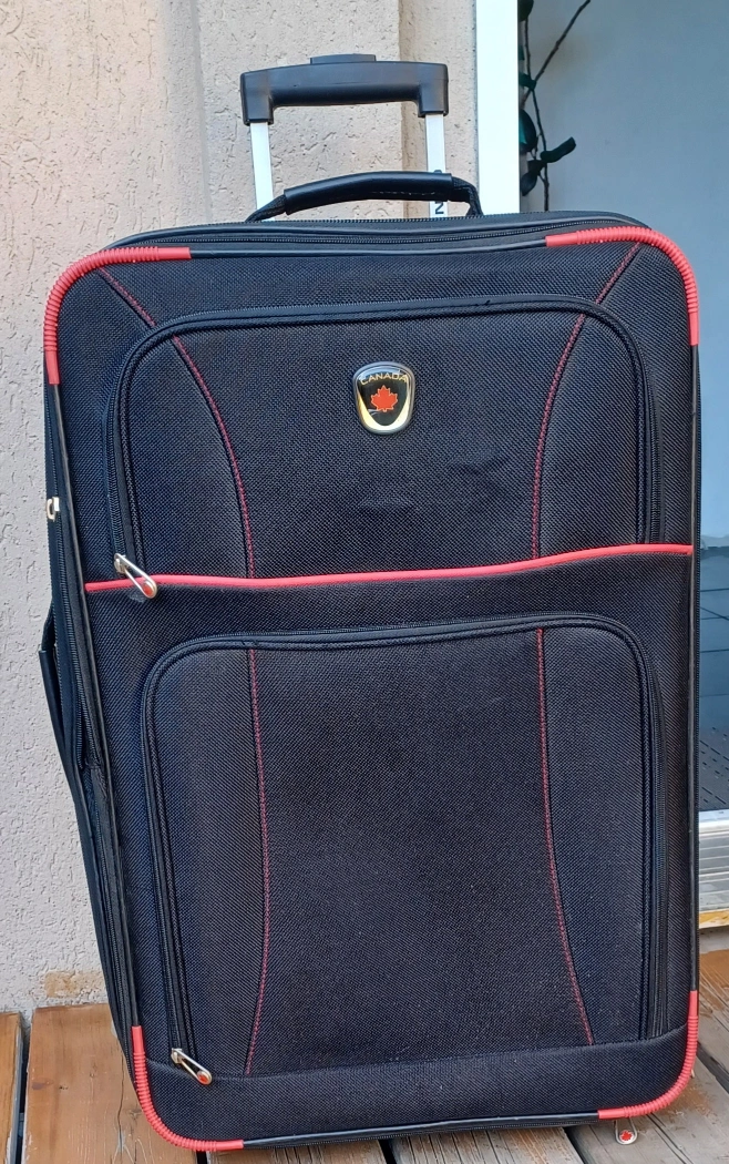 Rolling suitcase from Canada Luggage Co. in good condition! It's black with red trim and has a retractable handle and wheels for easy transport. The interior is spacious with a patterned lining and straps to secure your belongings. Dimension 24"×16"×7" it's clean no smell or something.