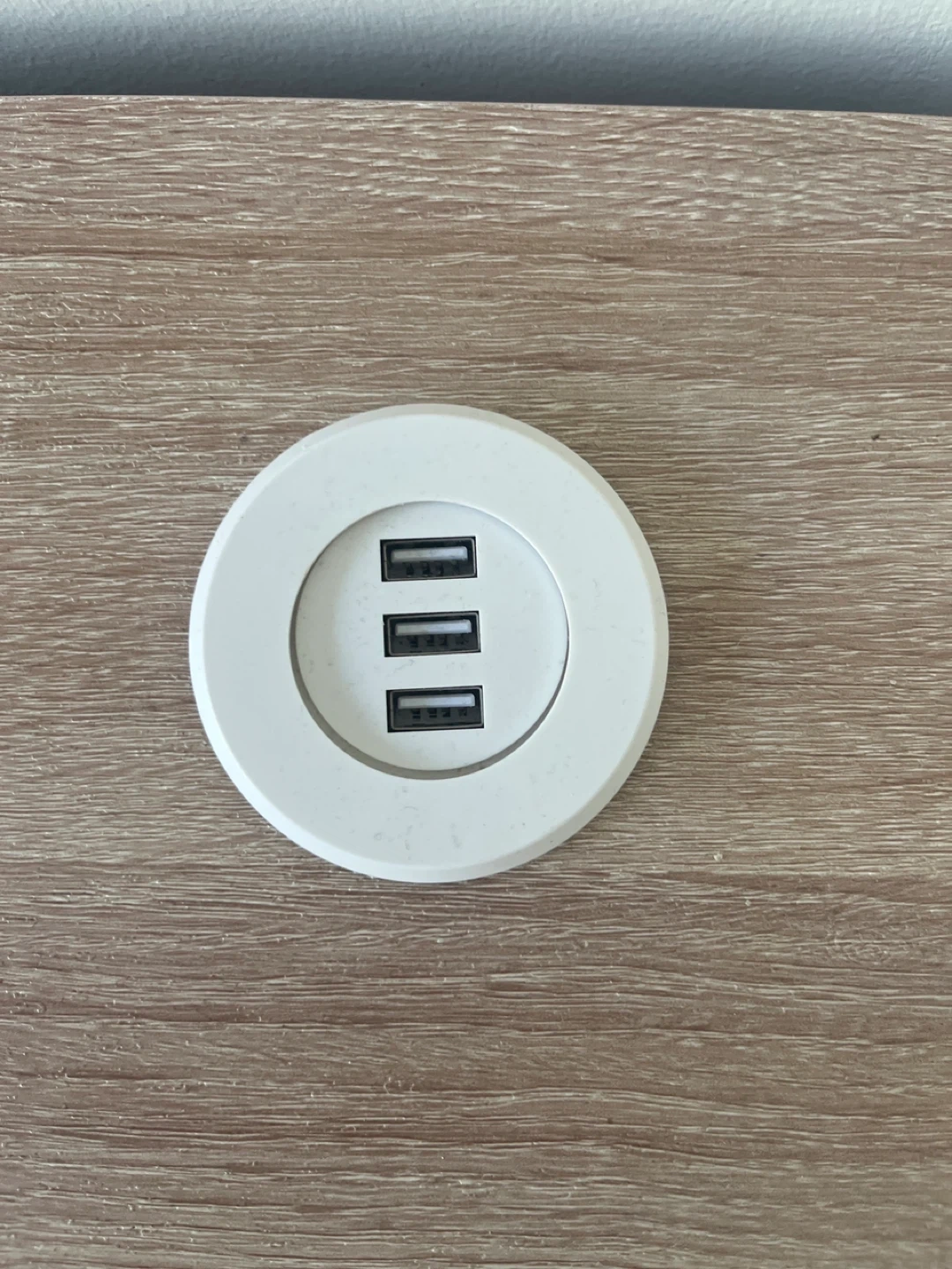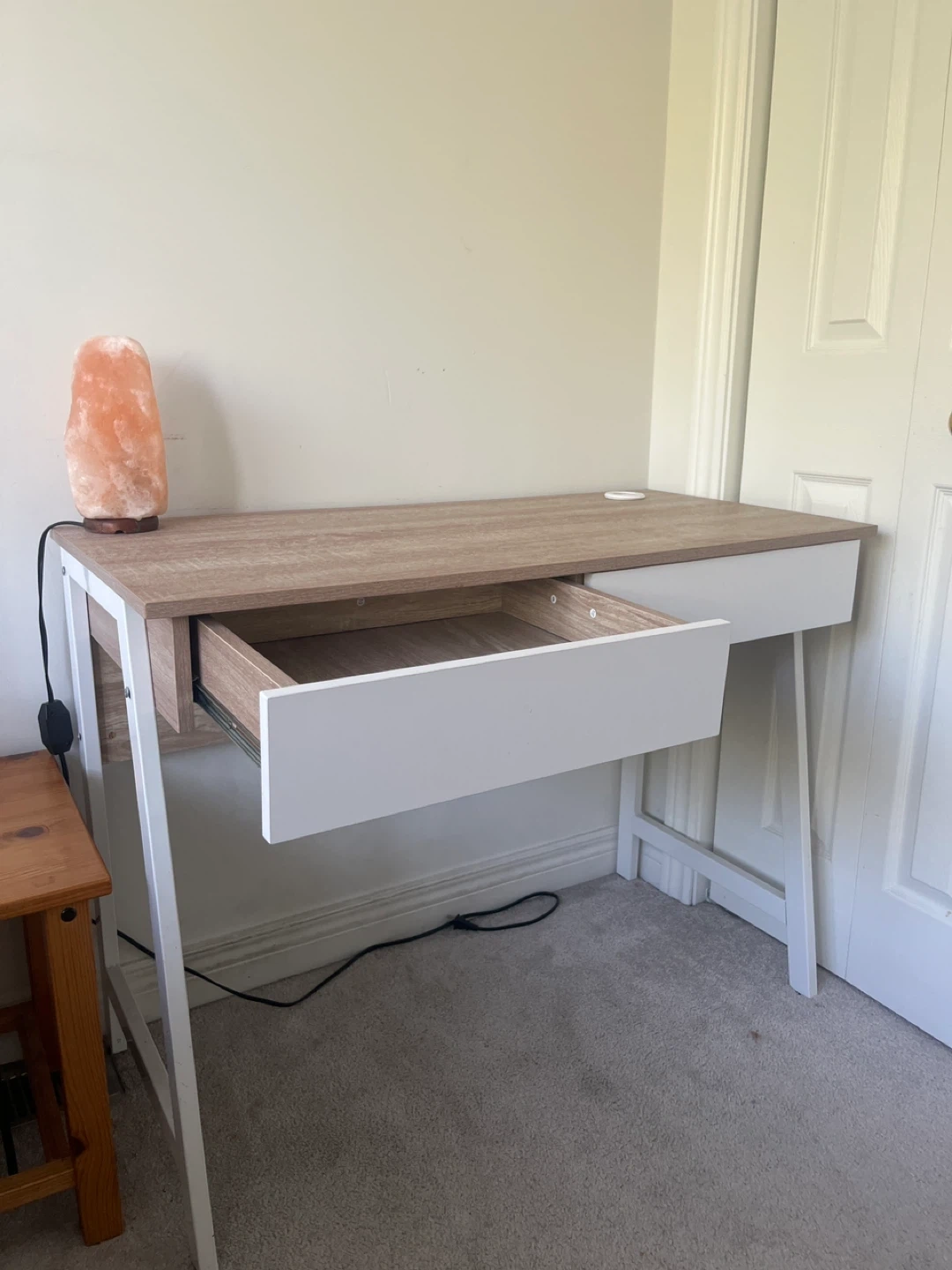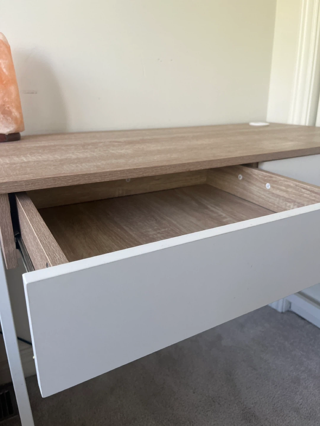 A desk with a light wood top and white drawers and legs. It also has built-in USB ports for easy charging of your devices. Great for a home office or student space! Salt lamp is optional, but feel free to take it as well!