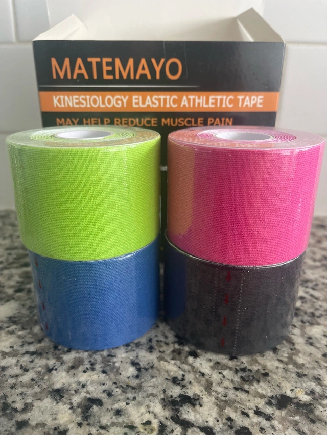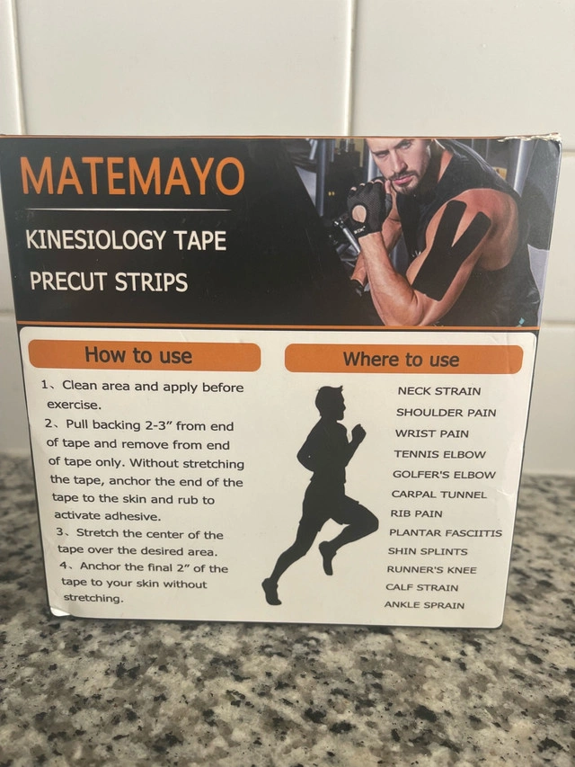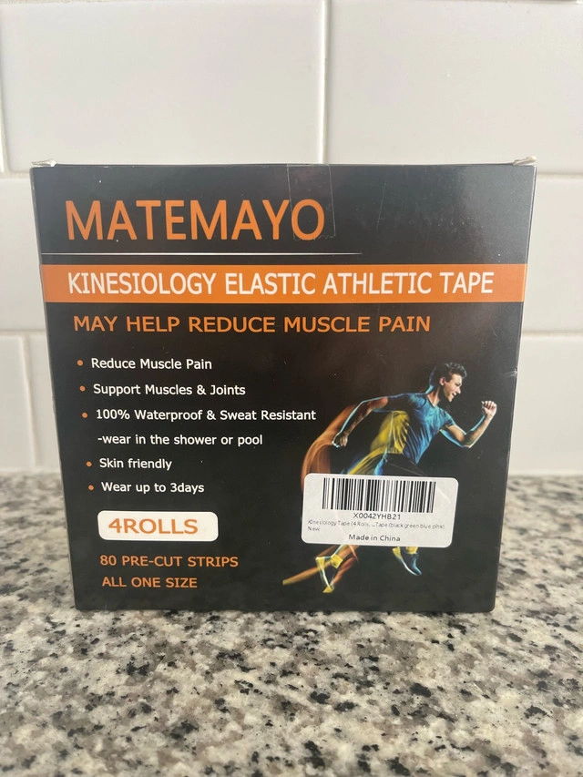 Matemayo Kinesiology Elastic Tape Brand New In Box 100% waterproof & sweat resistant 80 Precut Strips. Much easier to use. Online and instore $25.00 or more plux tax. Let me know if you're interested!