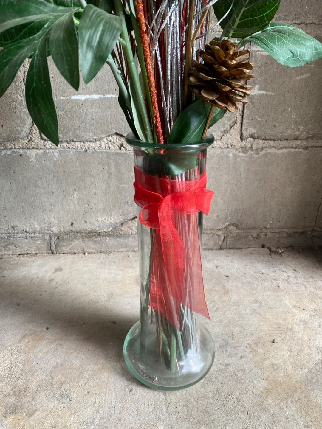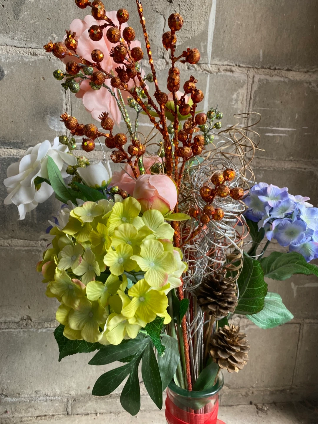 Selling a lovely floral arrangement that would brighten up any space! It comes with a variety of flowers in different colours, including yellow, blue, pink, and white. The arrangement is in a clear glass vase with a red ribbon. Perfect for adding a touch of nature to your home!