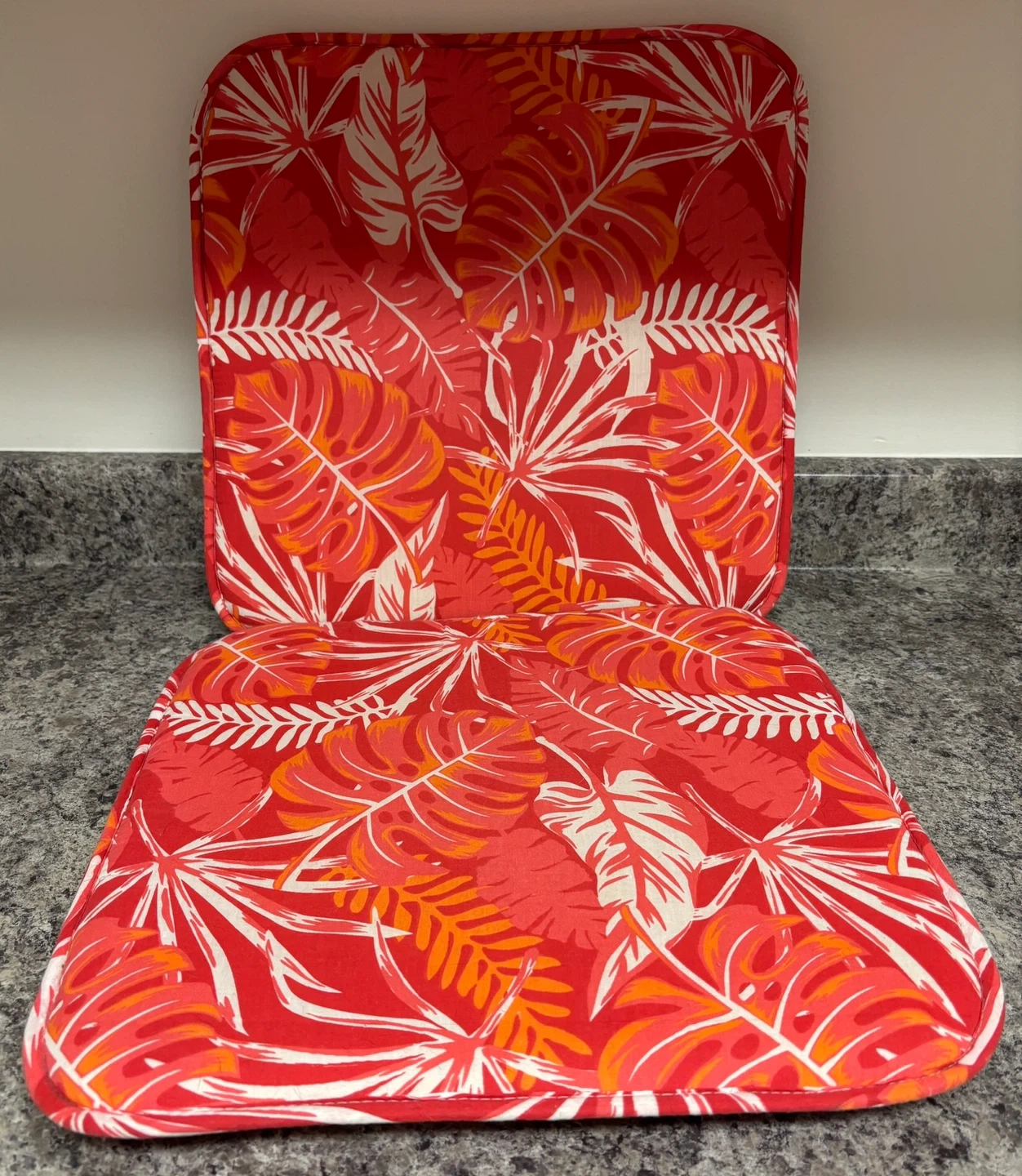 Here are some vibrant red chair cushions with a fun floral print! They're in great shape and ready to add a pop of colour to your chairs. Perfect for indoor or outdoor use, these cushions are sure to brighten up any space. $5.00 exact cash only Same pattern on other side Roughly 15 inches Both as is, info in photo