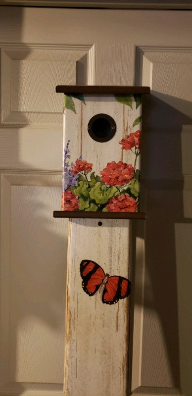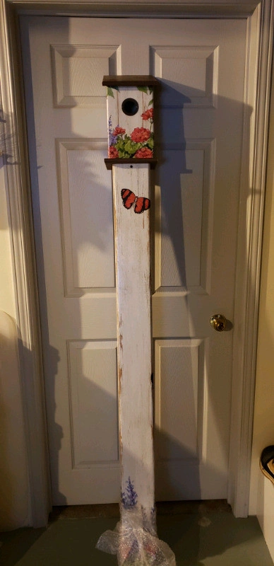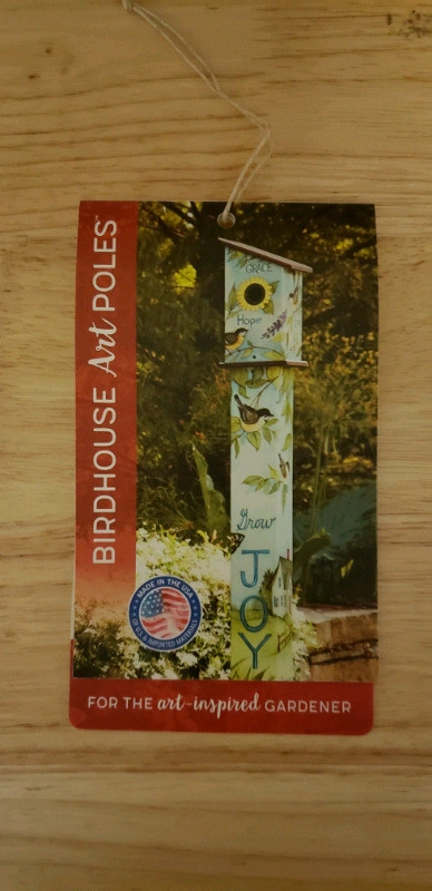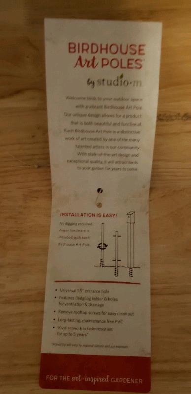 NEW - Birdhouse Art Pole with Stake - stands 6' tall. Features universal 1.5" entrance, removable roof top for easy cleaning, made of long lasting maintenance free PVV, vivid fade resistant artwork.