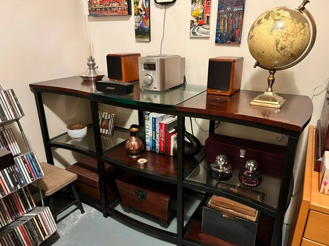 29” Tall, 53” Wide and 18” deep, this is a high quality curio/bookcase with thick tempered glass shelves. Like new, perfect for a family room or office. Price is firm. Obviously this ad is only for the curio.