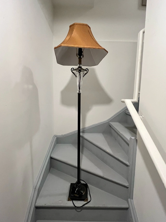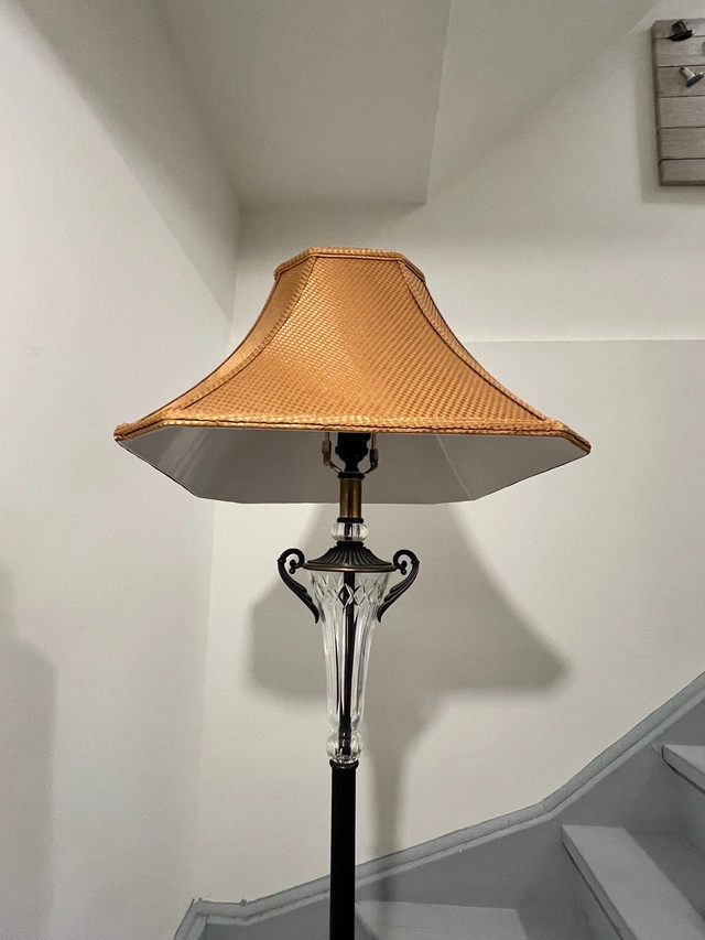 Elegant floor lamp featuring a crystal-style accent and a unique brown wicker-look shade. This lamp stands approximately 5 feet tall and provides a warm, ambient light, perfect for any living room, bedroom, or reading nook. It's in good condition and ready to brighten up your home. Specifications: * Height: Approximately 5 feet * Shade: Brown wicker-look material * Accent: Crystal-style