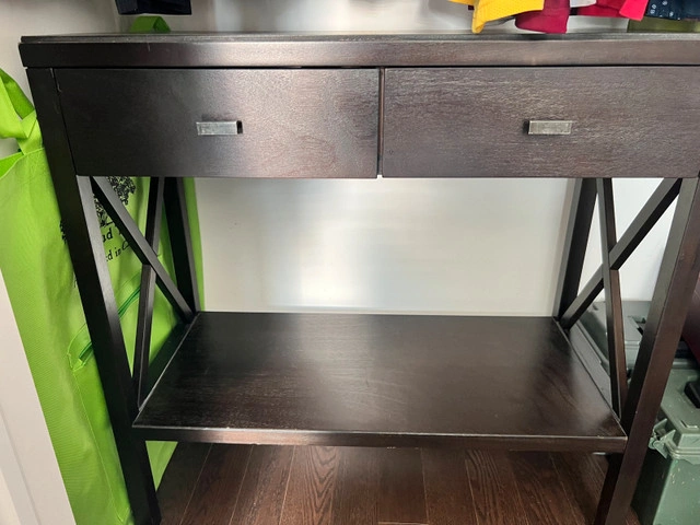 Add a touch of elegance to your entryway or living space with this stylish console table, featuring a dark wood finish, two drawers for storage, and a lower shelf for display. This table is in used but good condition, ready to enhance your home decor. * Dark wood finish * Two drawers with silver hardware * Lower display shelf * Sturdy construction Looking for a spot to showcase your favourite succulents or hide away those pesky keys? This console table is your answer. It's so versatile, it might just become the most talked-about piece in your home! Available? Absolutely! If the ad's up, it's up for grabs!