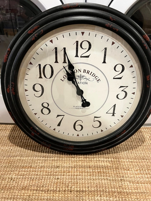 Add a touch of vintage charm to your home with this London Bridge Station wall clock! This used clock features a classic design with large, easy-to-read numerals and a distressed black frame, making it a stylish addition to any room. Its timeless appeal and functional design make it a perfect decorative piece! While it tells time like a pro, it has seen a few ticks and tocks, so it comes with a touch of character. Think of it as pre-loved! If the ad's up, the clock's still available—no need to ask! Happy decorating!