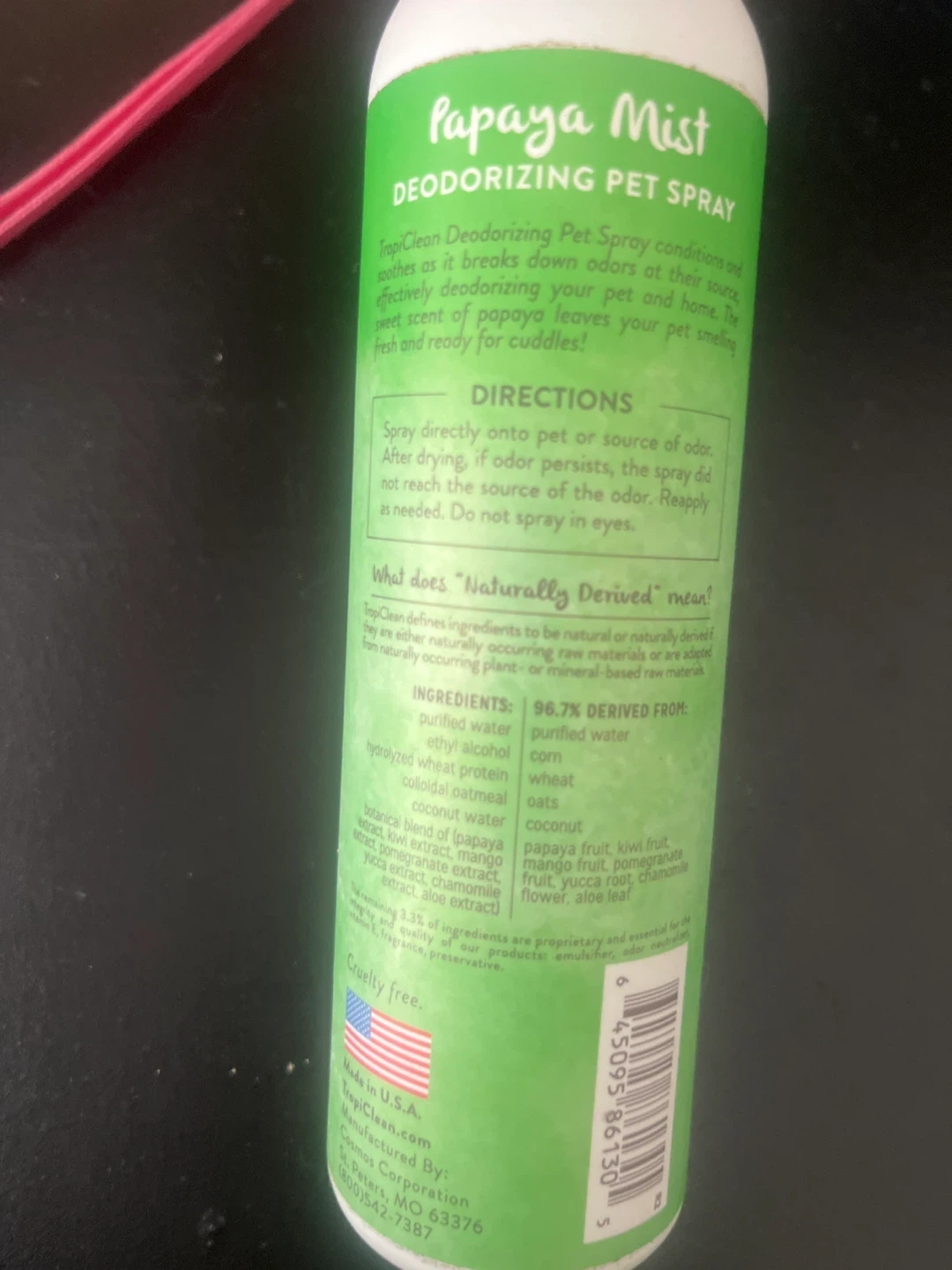 Freshen up your furry friend with TropiClean Papaya Mist Deodorizing Pet Spray! It's freshening for long-lasting scent. This spray is paraben and dye free. It contains 8 FL OZ (236 ml).