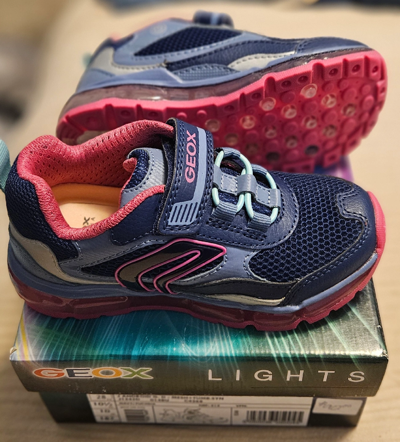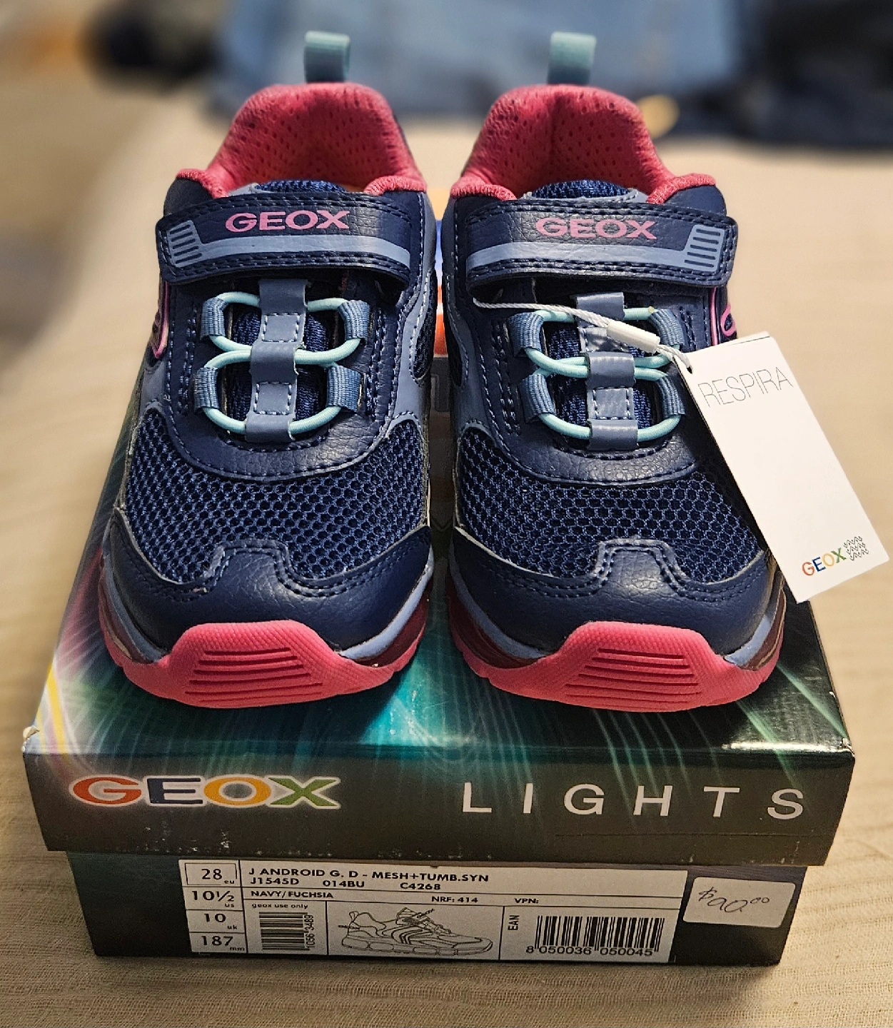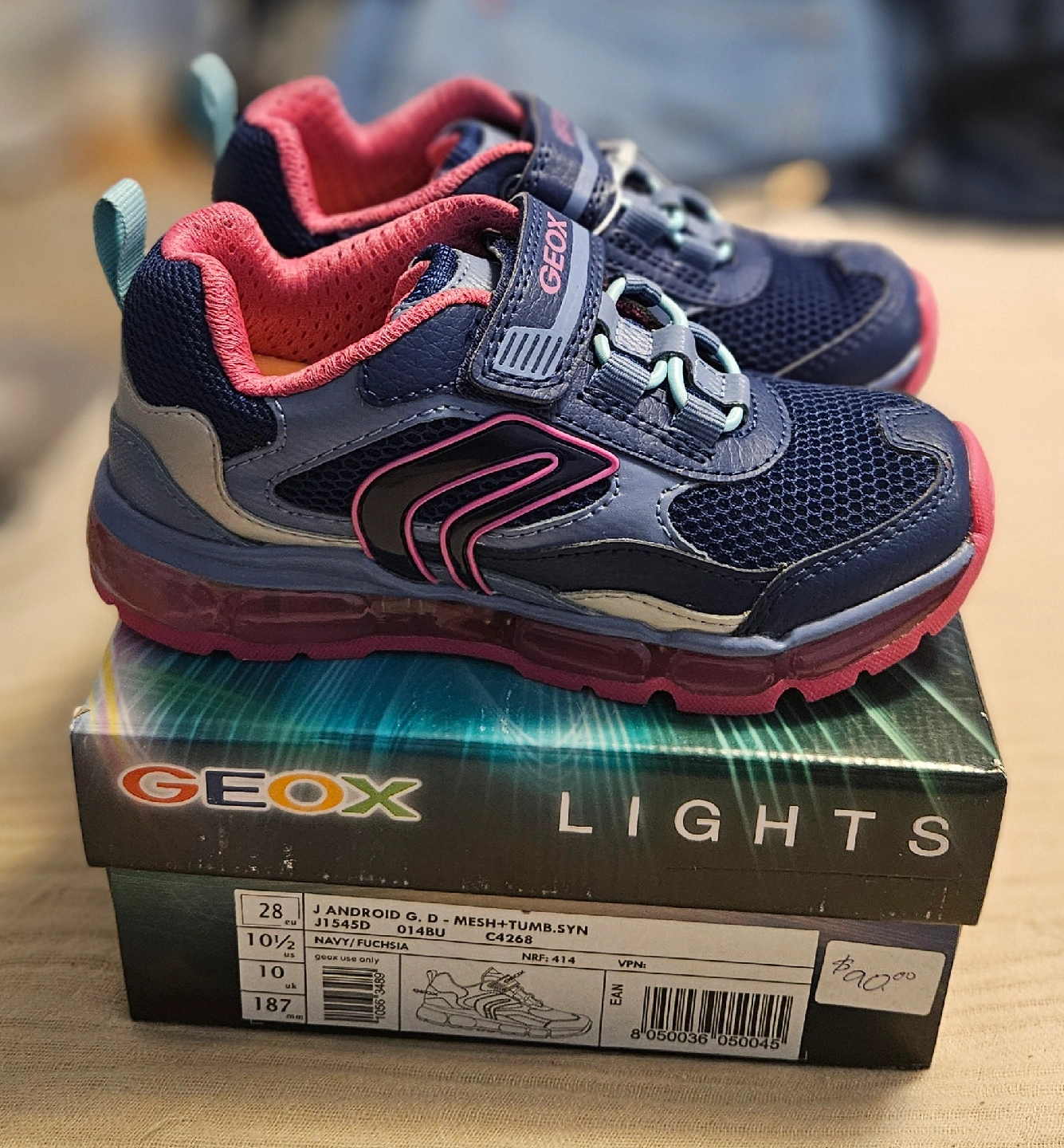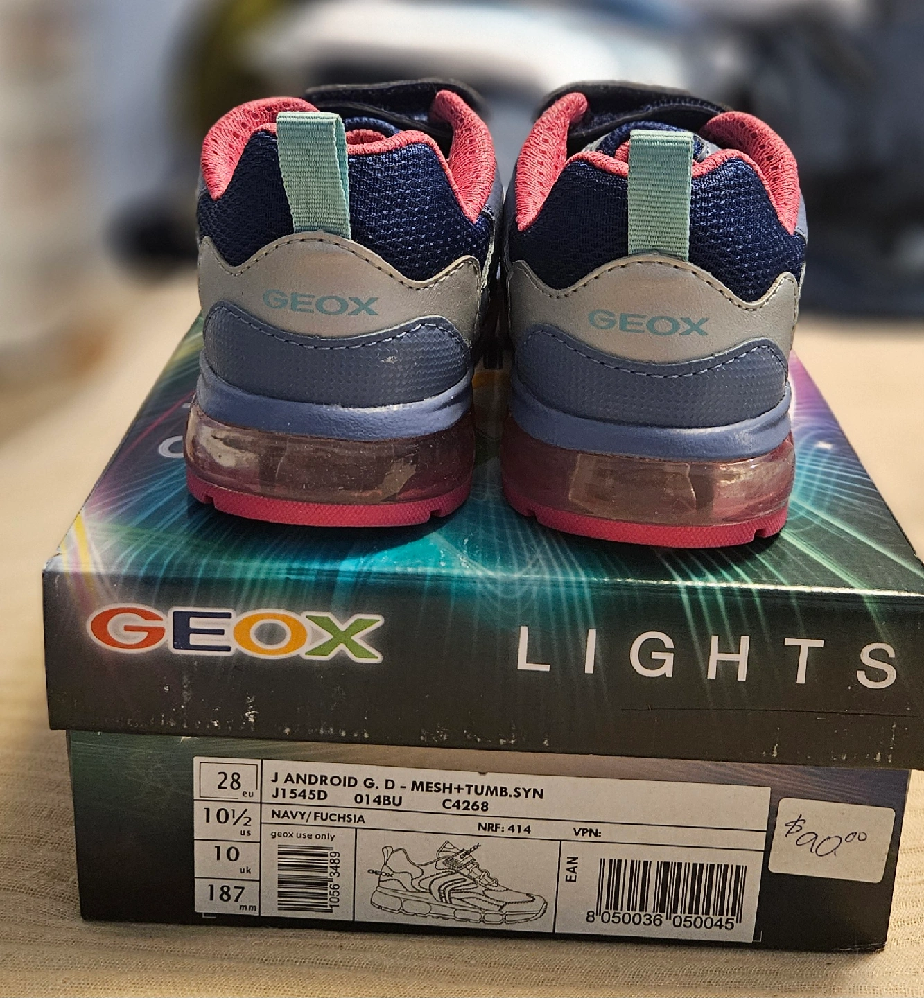 Brand New Geox Android light-up sneakers & come with the original box! They're a size 10.5 in US sizing and feature a stylish navy and fuchsia colour combination. The box indicates the style number is J1545D 014BU C4268. They originally retailed for $90.00