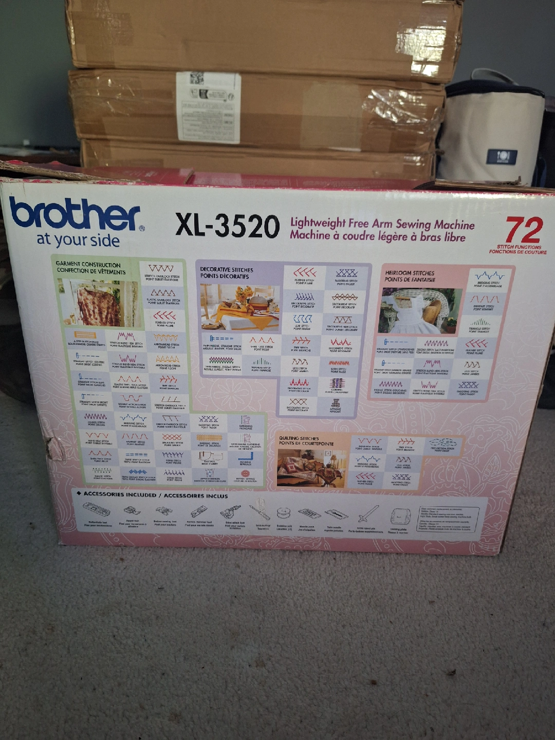 Selling a brand new Brother XL-3520 lightweight free arm sewing machine! It comes with 72 stitch functions for garment construction and decorative stitches. Also includes accessories for various sewing needs.