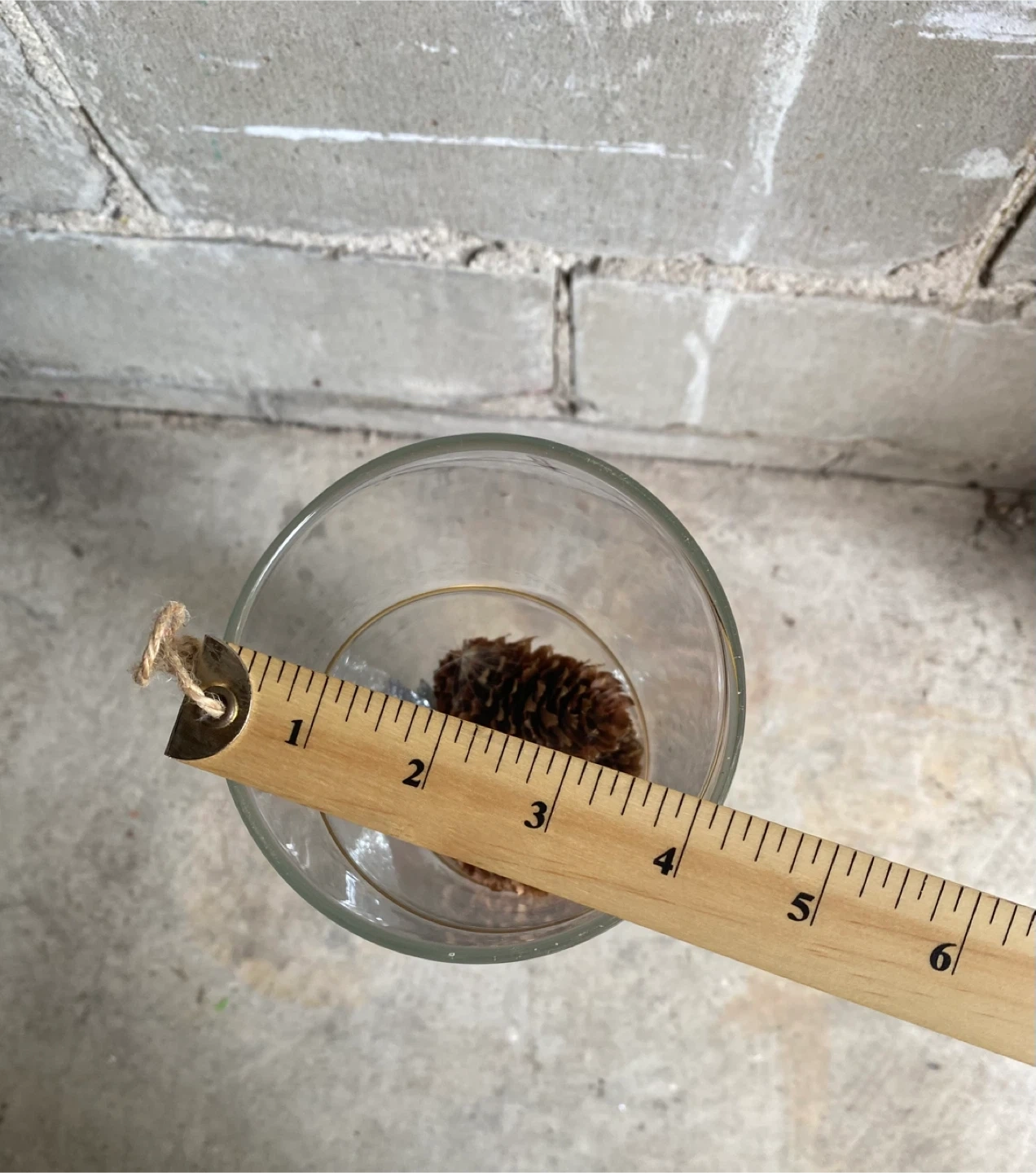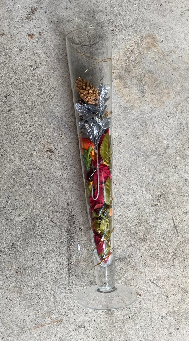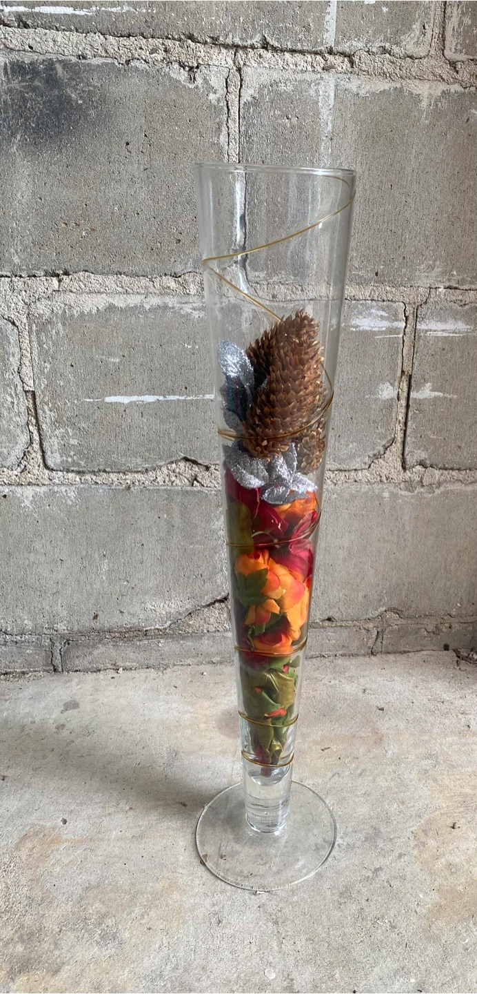 Selling a decorative tall glass vase. It's filled with pinecones, silver decorative pieces, and artificial leaves and flowers.