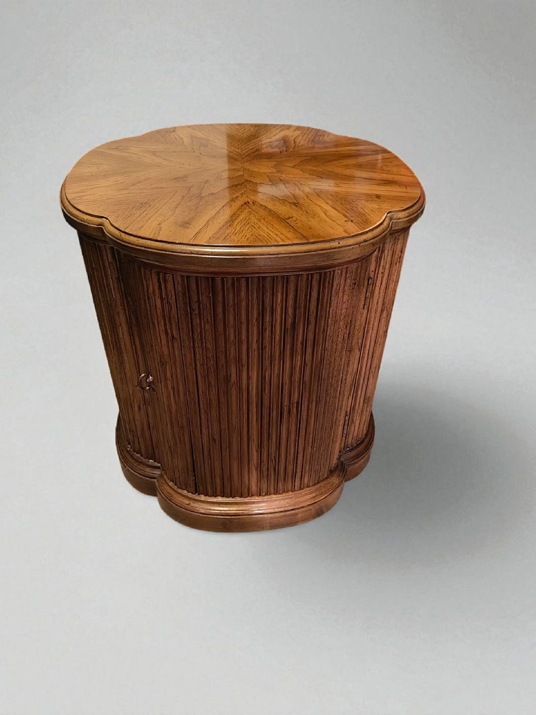 This is a used HENREDON burl walnut clover-shaped cabinet, offering both elegance and functionality. The cabinet features a unique clover shape with a door that opens to reveal storage space.