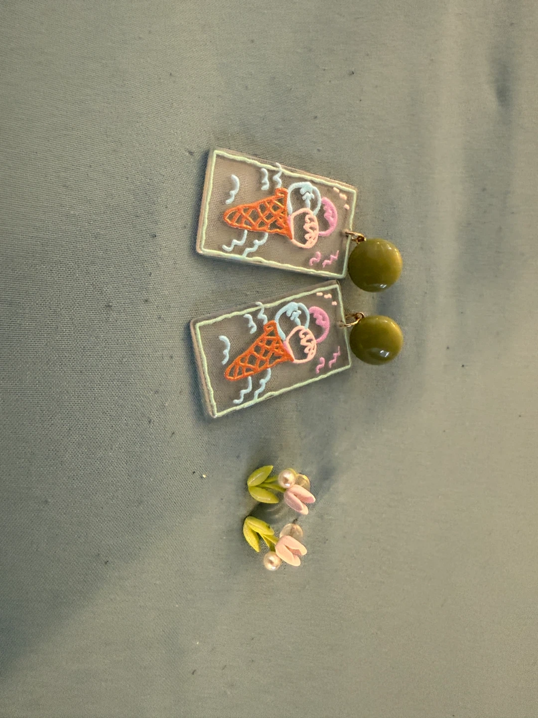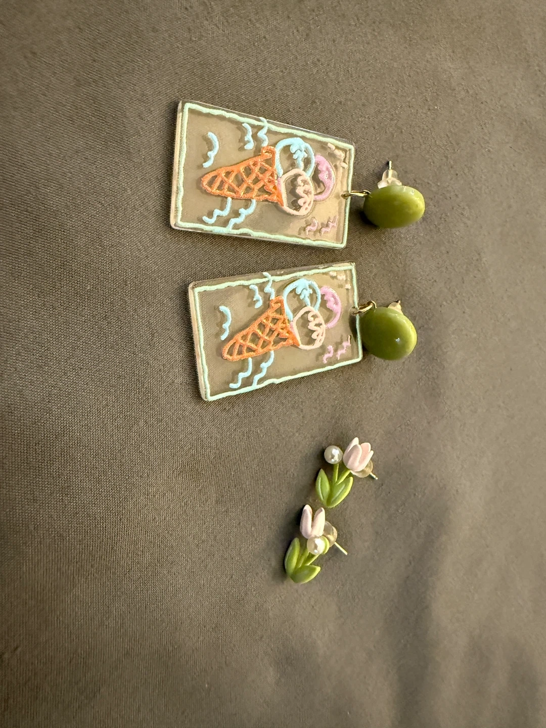 Cute earrings for sale! There's a pair with an ice cream cone design and another pair with a flower design. They're unique and perfect for adding a little fun to any outfit Take both for $5