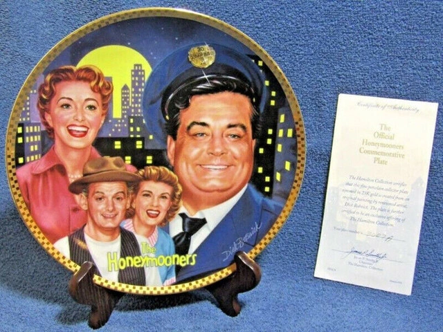 INCLUDES ALL ORIGINAL PACKAGING AND CERTIFICATES w/24k gold rim, 10" plate The Official Honeymooner's Commemorative Porcelain Plate Produced by The Hamilton Collection 1992 Artist Dick Bobnick , Limited Edition of 28 Firing Days. The Hamilton Collection Certifies that this fine Porcelain Collector Plate rimmed in 23 K Gold is Created from an Original painting by renowned artist, Dick Bobnick. The plate is further certified to be an exclusive offering of The Hamilton Collection. On the back it has The Hamilton Collection Presents The Official Honeymooner's Commemorative Plate By Dick Bobnick Limited to a total of 28 firing days This Plate had tremendous detail vivid color. Feel free to message if you have any questions!