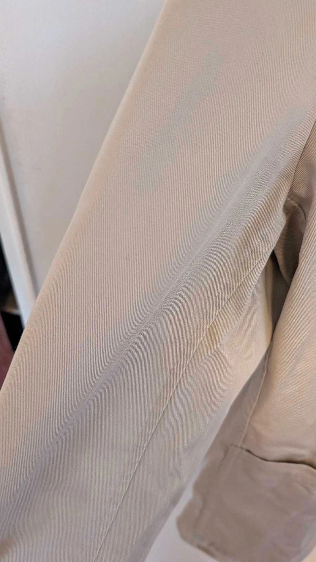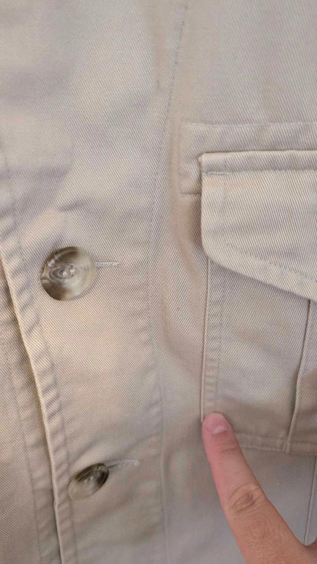 Brand new made in Canada Tilley light jacket. 100% cotton. Issues with it are some small brown stains that did not wash out on the arms as pictured. Pickups in East York ON or downtown near St. Andrew subway station on certain days. Happy to take measurements from serious buyers.