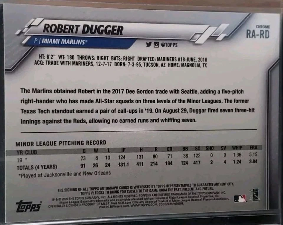 Chase the rookie potential with this Robert Dugger Rookie Autograph from the 2020 Topps Chrome series. Featuring a clean on-card signature, this RC auto captures Dugger’s debut in Topps’ sleek chrome finish. A great piece for Marlins collectors or anyone building out their 2020 Topps Chrome rookie auto set! Item Located: West Hamilton Mountain near Mohawk Rd and Rice Ave