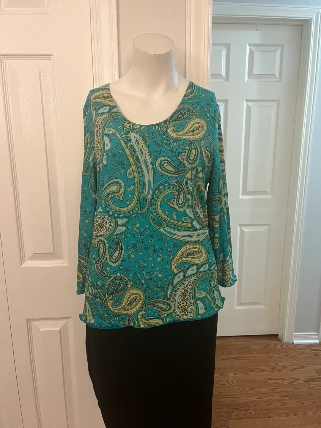 lovely Denver Hayes blouse! It features a teal paisley pattern and is a size medium. The material feels nice and lightweight, perfect for warmer weather or layering