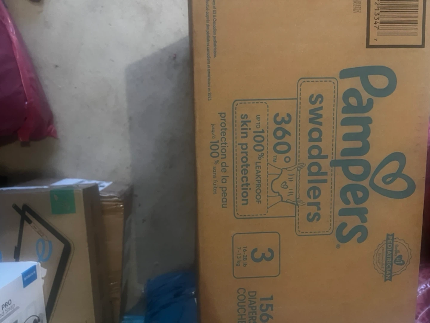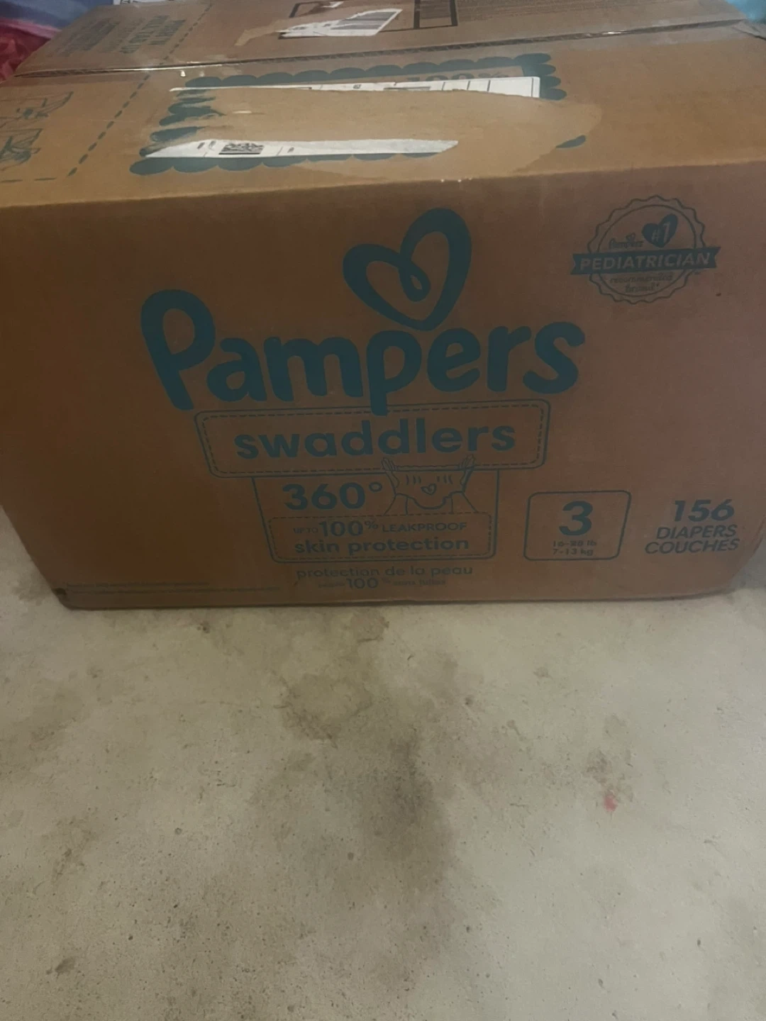 Selling a box of Pampers Swaddlers diapers, size 3. The box contains 156 diapers, perfect for babies weighing 16-28 lb (7-13 kg). They offer up to 100% leakproof skin protection, so you can rest easy knowing your little one is comfortable and dry