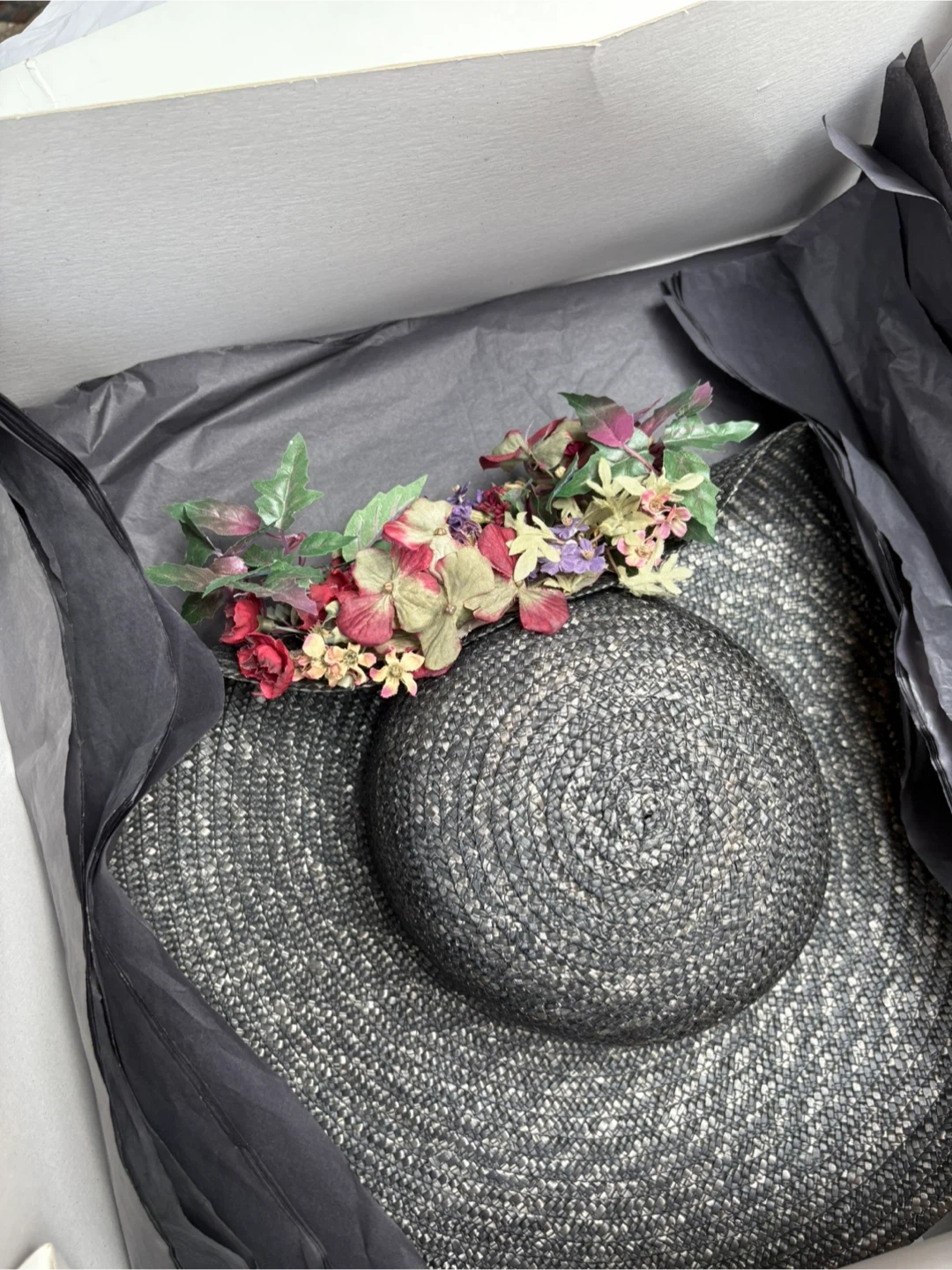 Beautiful black straw hat from Laura Ashley, adorned with lovely flowers! It's in great condition and ready to add a touch of elegance to your outfit. Perfect for an out door outing or an indoor outing. Especially fun wearing it while sipping on tea. Been kept in its original box.