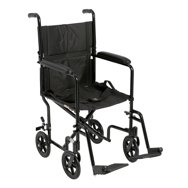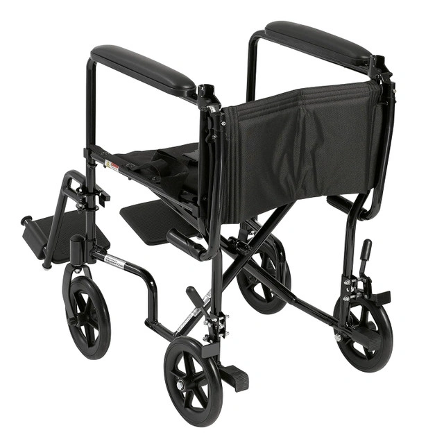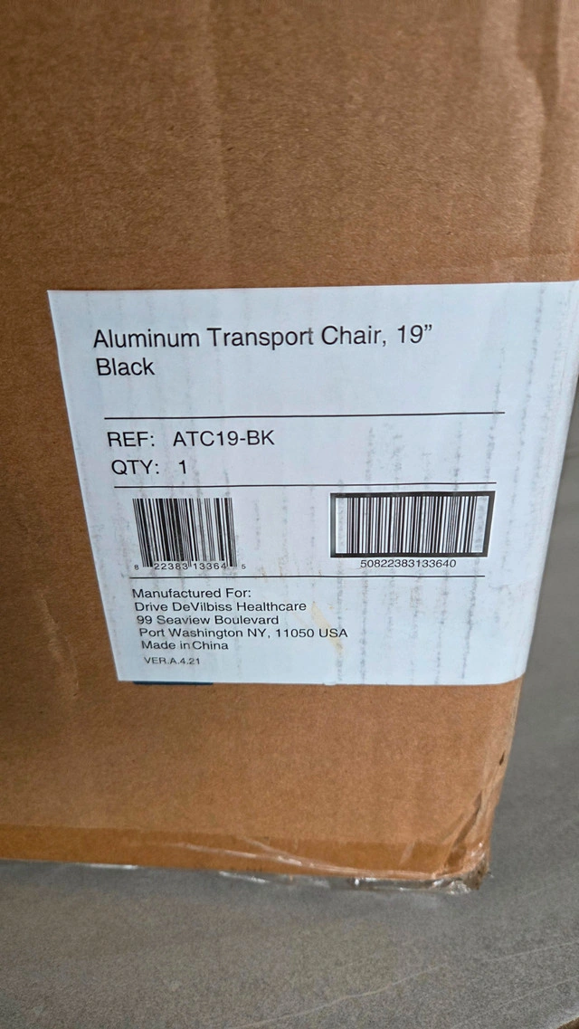 Brand new wheelchair. It comes pre-assembled in original box. Just attach the two foot rest. Drive Medical ATC19-BK Lightweight Aluminum Transport Wheelchair with Swing-Away Footrest, Black Product details: Brand: Drive Medical Colour: Black Item weight: 8.62 kg Style: Compact Product Dimensions: 83.8D x 55.9W x 100.3H Centimetres Material: Aluminum Lightweight Folding Wheelchair: Compact and easy to push, our ultra-lightweight folding transport wheelchairs for adults weigh just 19 pounds and offer comfortable mobility with a 19-inch seat, padded armrests, and swing-away footrests Portable Wheelchair: Our transport chairs for seniors are lightweight and fold with ease; aluminum-casted release hinge allows the back to fold down for easy storage and transport Comfortable Support: Enhanced with nylon upholstery, our ultralight wheelchairs also feature tool-free, height-adjustable footrests for comfortable and dependable support Durable Design: This rolling wheelchair is made of an aluminum frame that is durable and strong; portable wheelchair's composite 8-inch wheels are lightweight and maintenance-free Specifications: Folded: 33 inches in length x 22 inches in width x 39.5 inches in height; seat: 19 inches in width x 16 inches in depth; armrest: 8 inches in height; weight capacity: 300 lbs