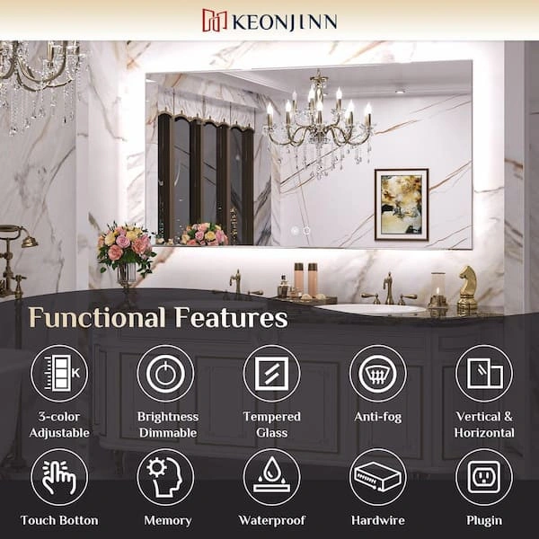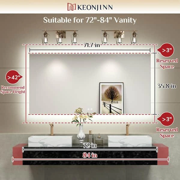 Brand new mirror. It comes in original box with mounting hardware. Plug-in ready. Retails for $914 ($809 + tax). Save your money. Pickup from south London. I can deliver in London for an extra fee. KeonJinn 72 x 36 Inch Rectangular Frameless Backlit LED Light 3-Color Dimmable Anti-Fog Wall Bathroom Vanity Mirror Product details: Brand: KeonJinn Shape: Rectangular Dimensions: 72 x 36 x 1.6 Inch Mirror Oriention: Vertical/Horizontal Features: Anti-Fog, Deluxe Glass, Dimmable, LED Lighted, Touch Sensor Light Colour: 3 Colour Dimmable Durable and Shatter-proof: 4mm tempered glass is shatterproof and explosion-proof, making it more sturdy, durable and safe. Ultra-thin design, 1.57in overall thickness Safe design: acrylic wrapped light stripe Adjustable 3 Colors Temperature: Warm(3000K), Natural(4500K), and White(6000K) Brightness Range from 5% to 100%,CRI>90+ Powered by Plug or Hardwire IP54 waterproof allows safe use in damp environment, UL Certification Fast and safe defogging provides HD clear reflection Memory function: seamlessly return to preferred settings 50,000 hours LED lifetime Mounting hardware included