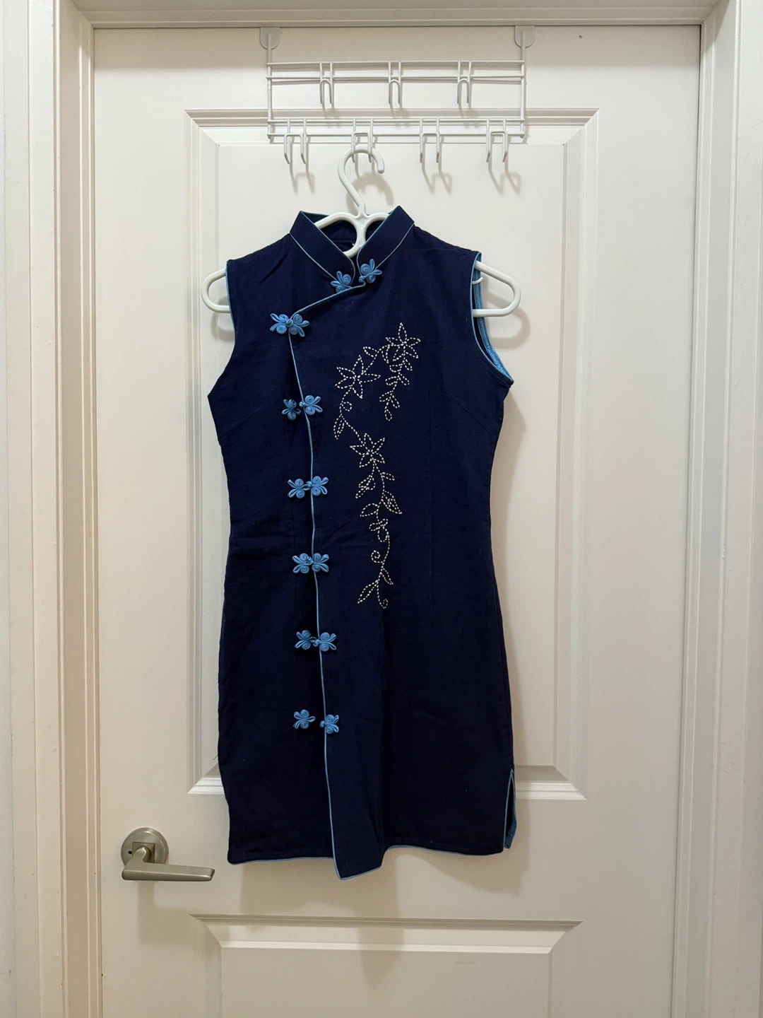 This is a navy blue sleeveless cheongsam dress. It has light blue accents and a floral design. Perfect for a special occasion or a stylish everyday look!