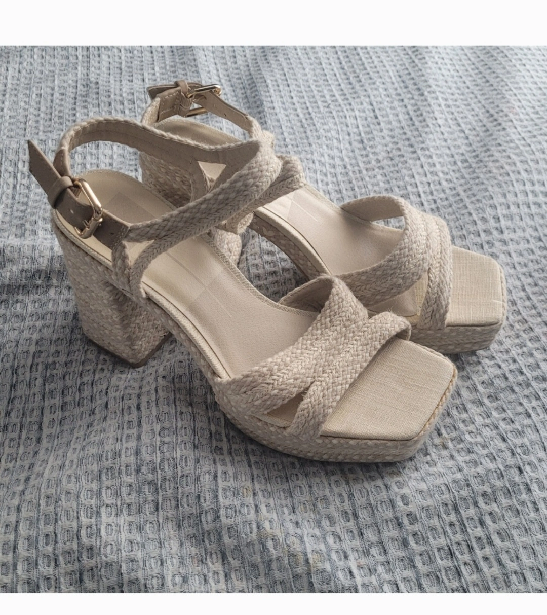 These Dolce Vita Tan Espadrille Platform Sandals are a stylish addition to any wardrobe! They feature a woven design and a comfortable block heel. Size 9. There are some signs of wear on the soles, but otherwise in good condition