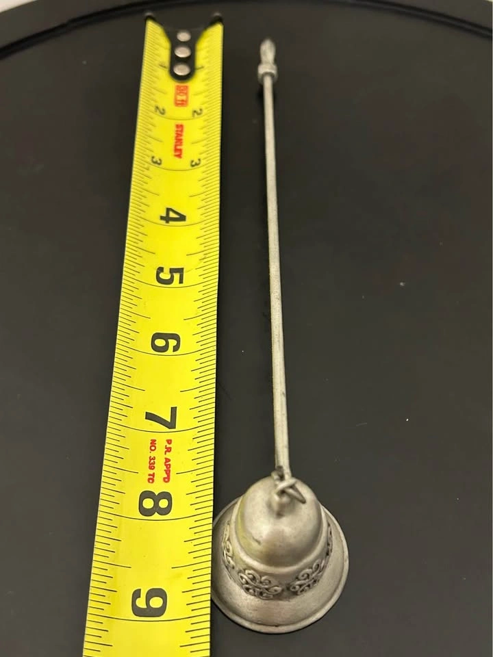 Elegant vintage snuffer in the shape of a bell, featuring ornate floral swirl patterns around the bell and a long decorative handle with a pointed end. Perfect for safely extinguishing candles while adding a touch of charm to your décor. Functional and collectible piece. Pick up: Seton area, Calgary. See also my other lots. Open to your questions and suggestions. If necessary, I provide additional photos. These are not new things, so please look carefully at the photos and videos. Sizes are submitted on request and also using a tape measure in the photo.