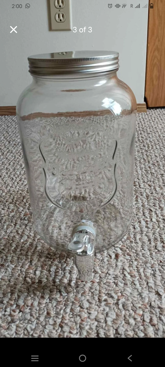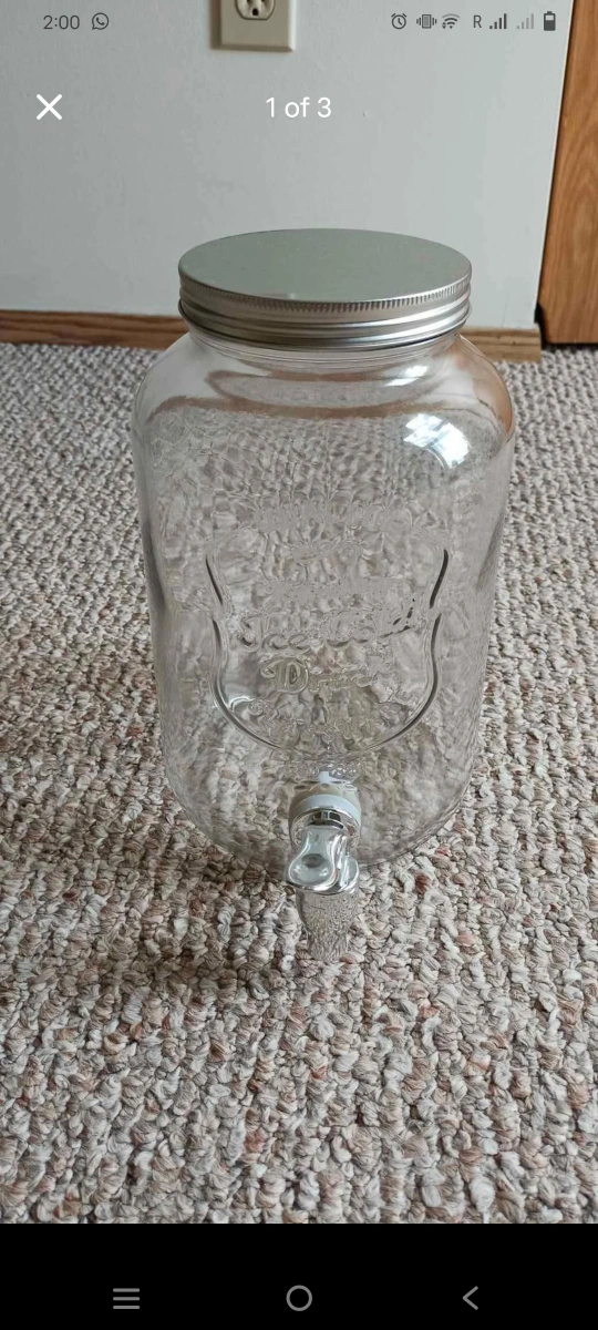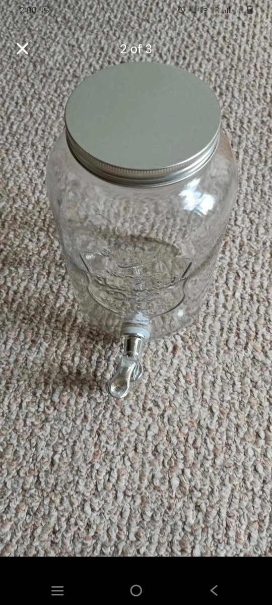 I'm selling a glass drink dispenser with a spigot! It's perfect for parties, gatherings, or just keeping your favourite beverage on hand. The dispenser is in great condition and ready to use. It features a clear glass body and a silver-colored lid and spigot.