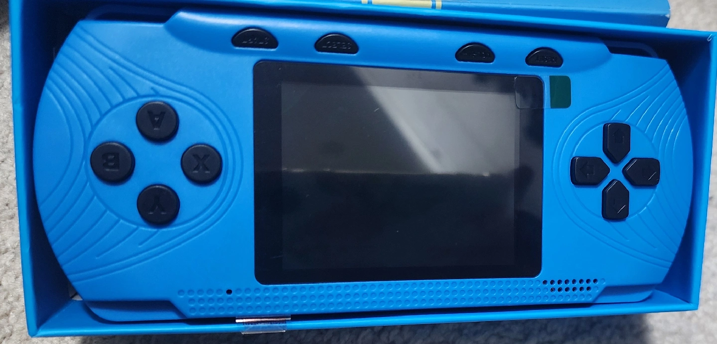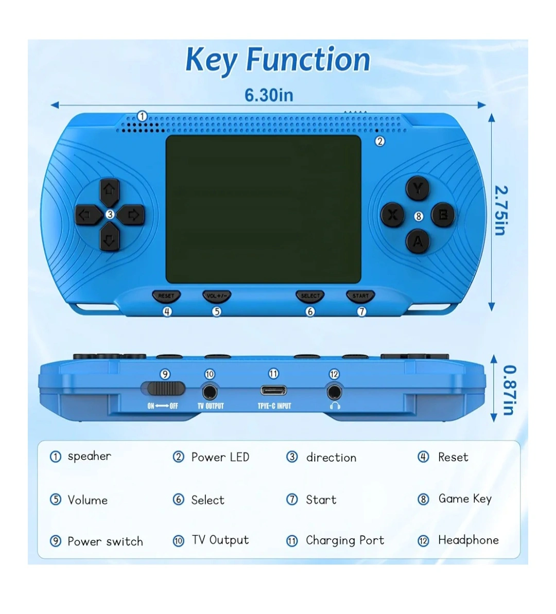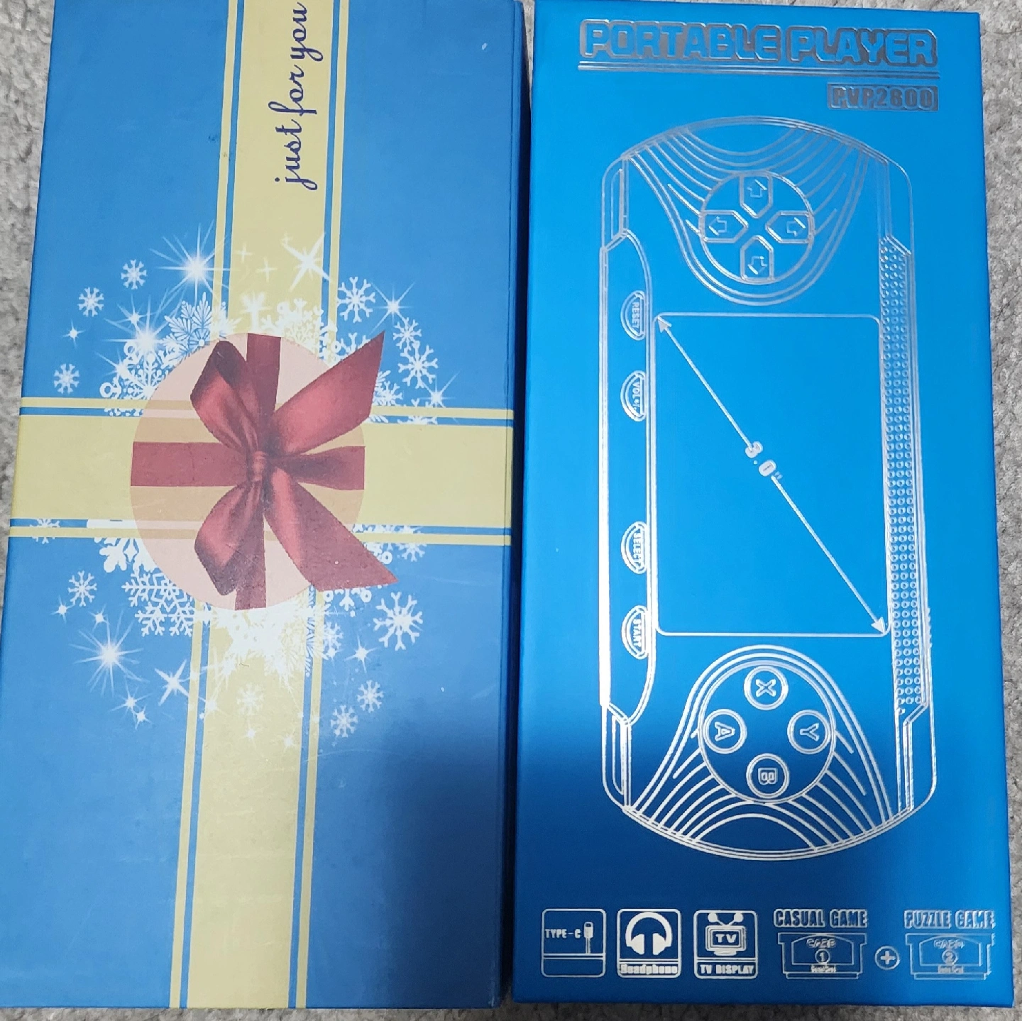 Selling a blue Portable Player BVP2600 handheld game console! It comes with the original box and accessories, including the AV cable, charging cable, and two game cartridges. The console's dimensions are approximately 6.30 inches in length, 2.75 inches in height, and 0.87 inches in thickness. Perfect for some retro gaming on the go!