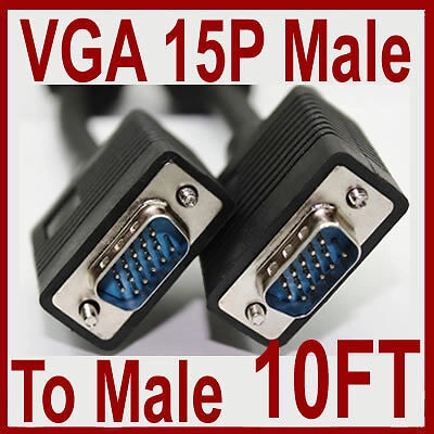 For sale, brand new 10FT (3m) VGA SVGA Cable Male-Male Extension Cable. Features: High quality HD15 pins male-to-male VGA Extension Cable for your monitor. This VGA Cable connects PC or laptop to the projector, LCD monitor, and other video display system through VGA connections. Fully shielded VGA/SVGA extension or replacement cable. Each VGA Cable have two high density HD15 connector with thumbscrews. Connector: HD15 Male to HD15 Male (15-pin). Cable Length: 10FT (3m). Package Includes: 1 x 10FT (3m) VGA Male To Male Extension Cable.