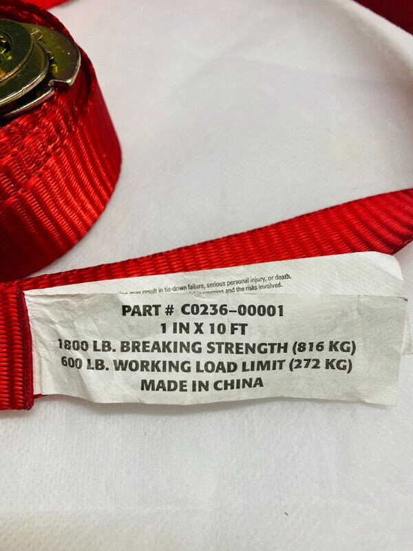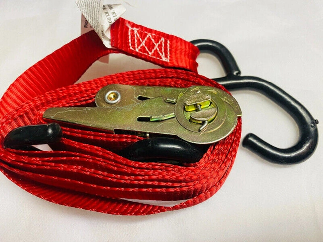 Ratchet Tie Downs secures heavy-duty loads to your truck bed or trailer or other work load. 1,800lb break strength, 600lb safe work load. Two shot overmolded handle, sew-in soft tie loop, pre-fed webbing. Length: 10ft. Check out my other ads for more items.
