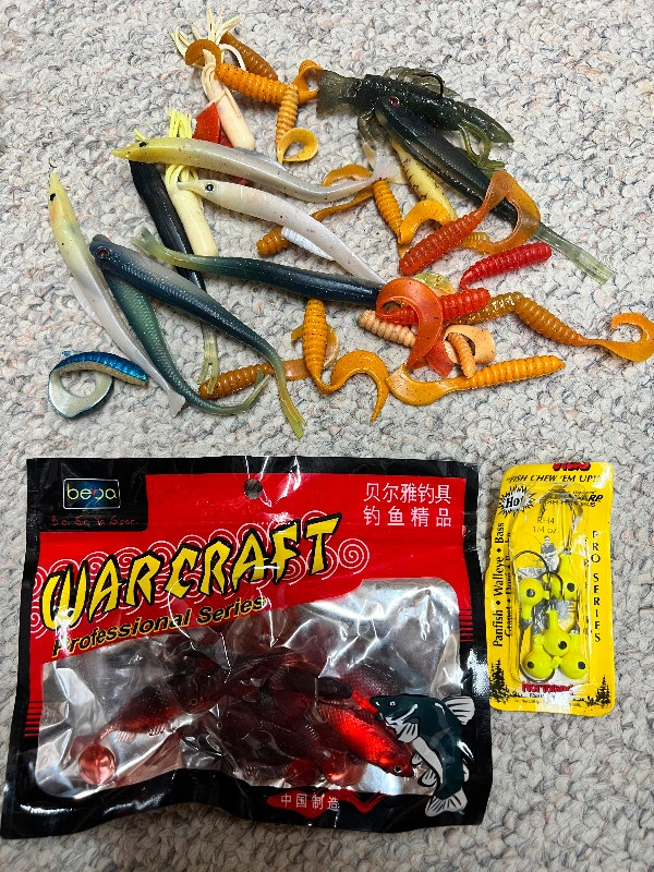 For sale various new and used fake baits and fishing line spool. _Brand new bag of red fake fish bait - $5 _All used fake baits (worm, shrimp, fish) - $5 _Box of new hooks pro series - $5 _Fishing line, clear, 330yd, 10lbs, 0.012" DIA. (0.30mm) - $7 BUY ALL FOR $20
