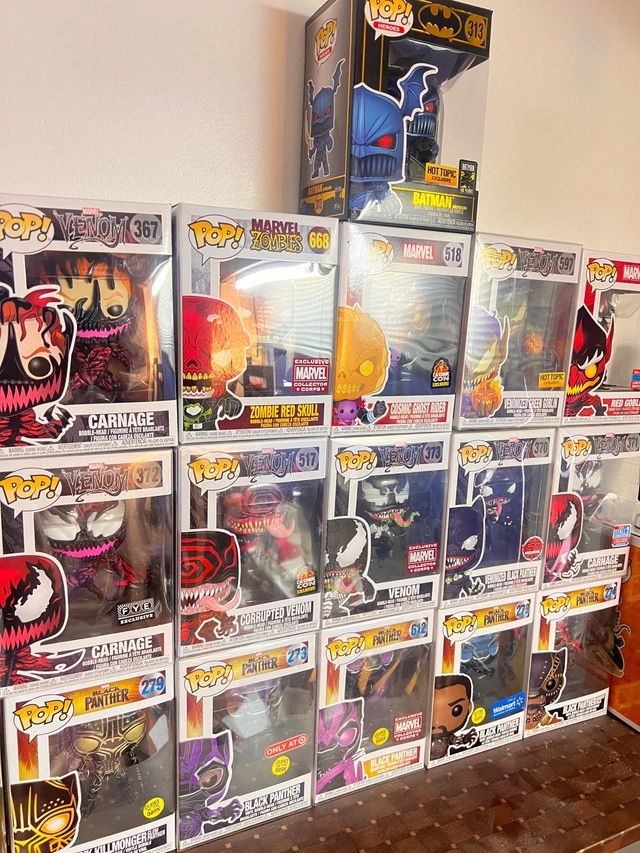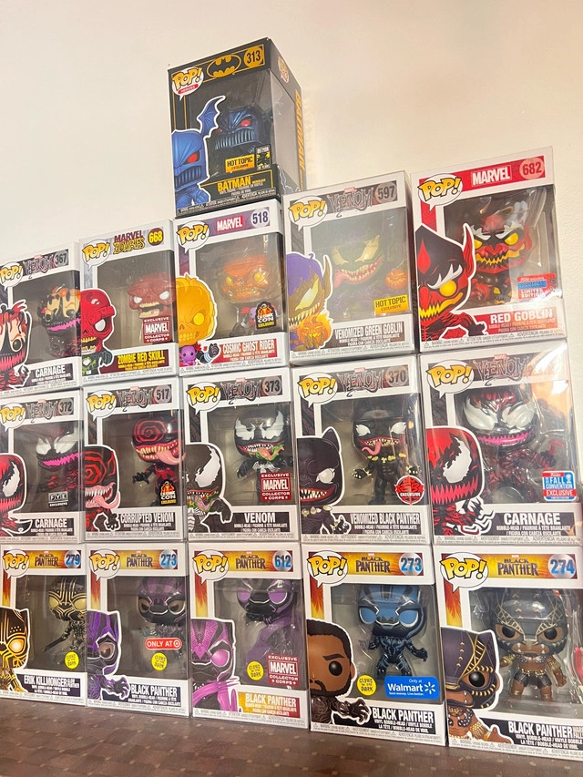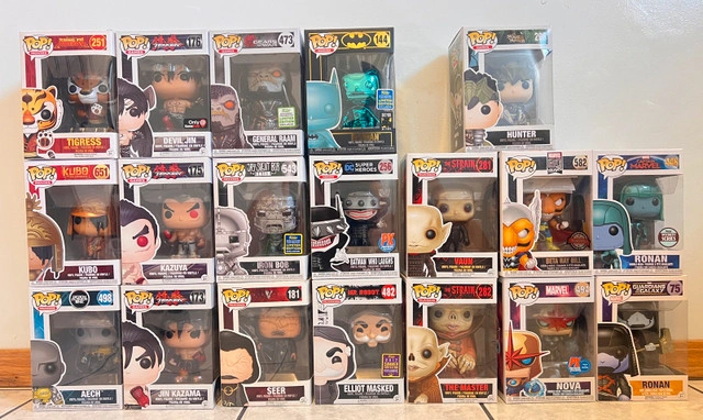Price listed either cheaper or base off funko app trending value. Buy multiple for discount. I do have reference, please buy with confidence. Peter Tingle T-shirt (size M)- $8 Batman Who Laughs- $55 Batman Teal Chrome- $35 Batman Merciless (HT)-$20 Carnage - $15 Cosmic Ghost Rider- $23 Nova (Metallic)- $20 Beta Ray Bill- $15 Zombie Red Skull (MCC)- $20 Ronan the Accuser, GOTG- $15 Ronan Metallic (Specialty)- $29 General Raam, GoW- $30 Hunter, Monster Hunter- $15 Elliot Masked, Mr Robot (SDCC)- $35 Seer, Viking- $25 Iron Bob (2020 Summer Con)- $15 Aech, RPO- $5 ••The Strain•• (buy both for $25) The Master- $17 Vaun- $15 •••Tekken•••(buy whole set for $95) Kazuya- $35 Jin Kazama- $35 Jin Kazama (Devil)- $35 •••Disney••• Kubo - $10 Tigress, Kungfu Panda- $25
