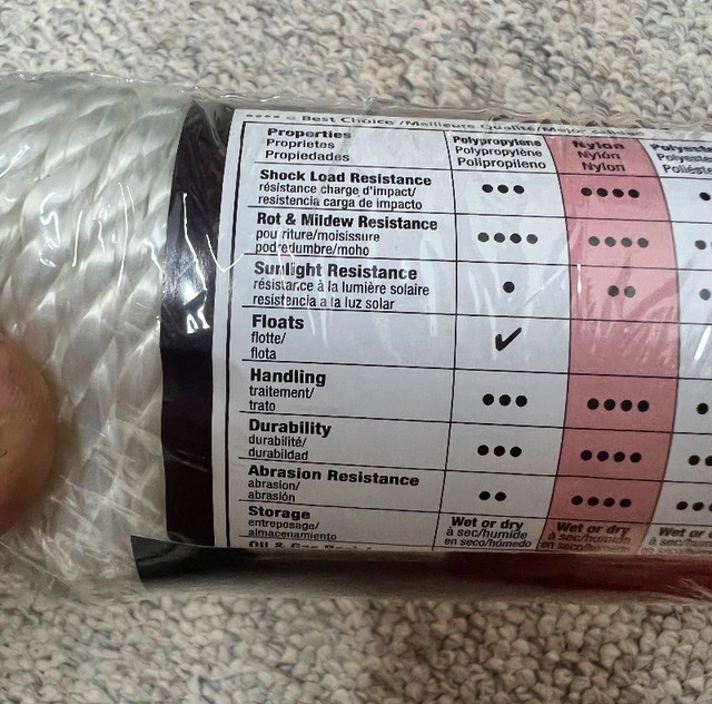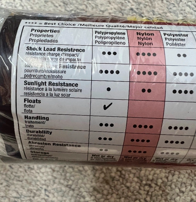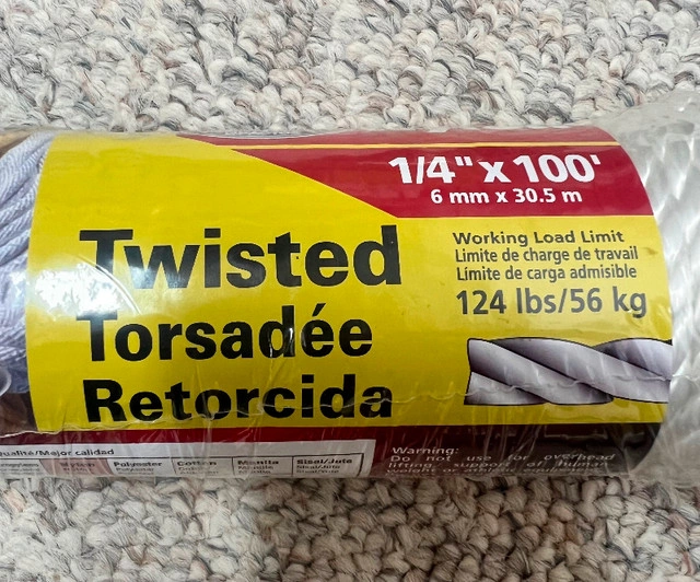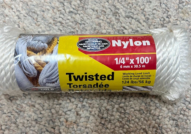 New in package Nylon Twisted Wire 1/4” - 100ft - 124lbs load. Shock absorbing. 14" x 100ft (6 mm x 30.5 m) Working Load Limit 124 Ibs/56 kg. Heavy duty. Can be use in various application.