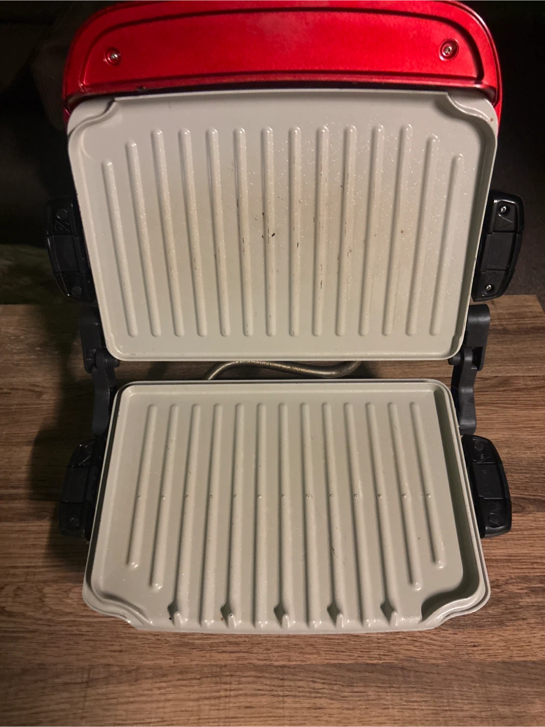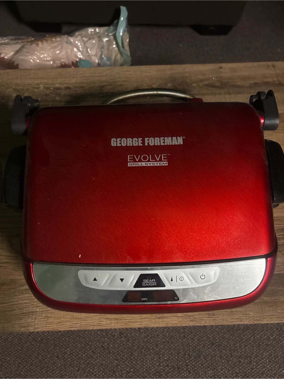 Selling a George Foreman Evolve grill system in red. It comes with the grill plates plus some extra attachments for different cooking options. Great for quick and easy meals!