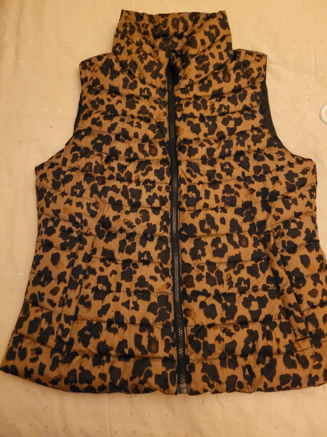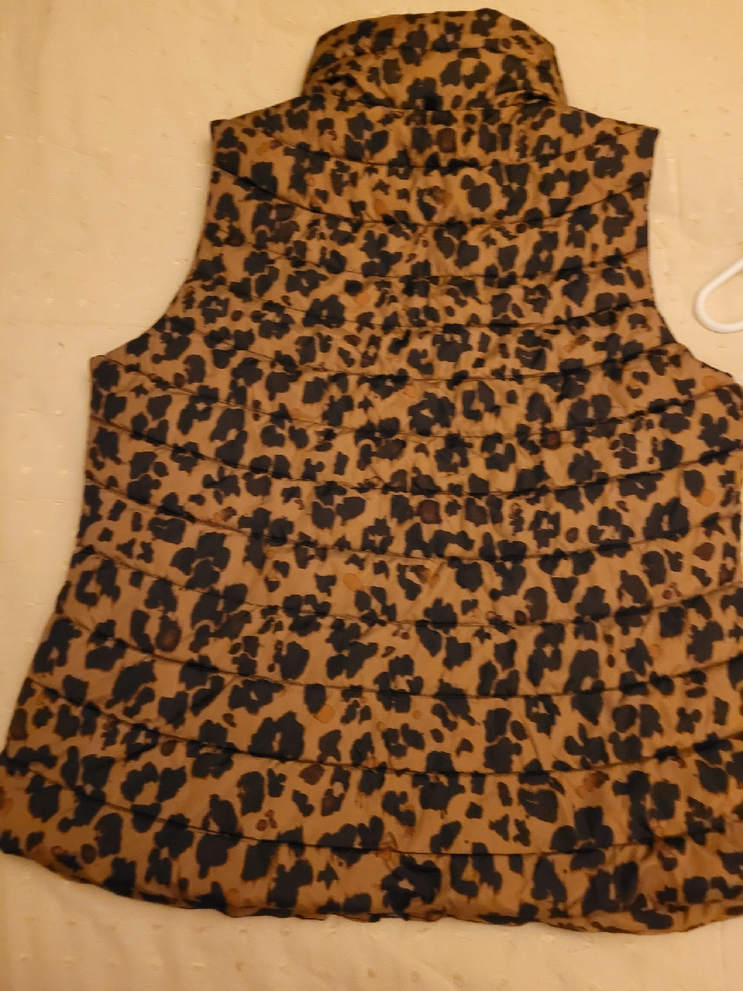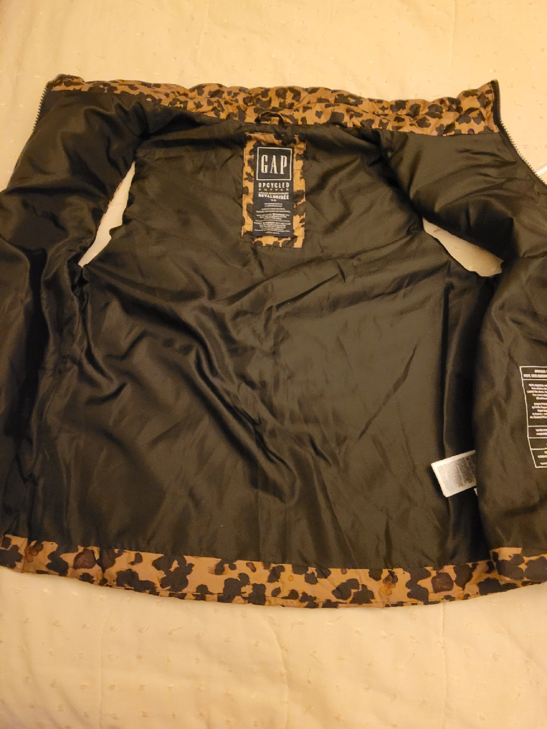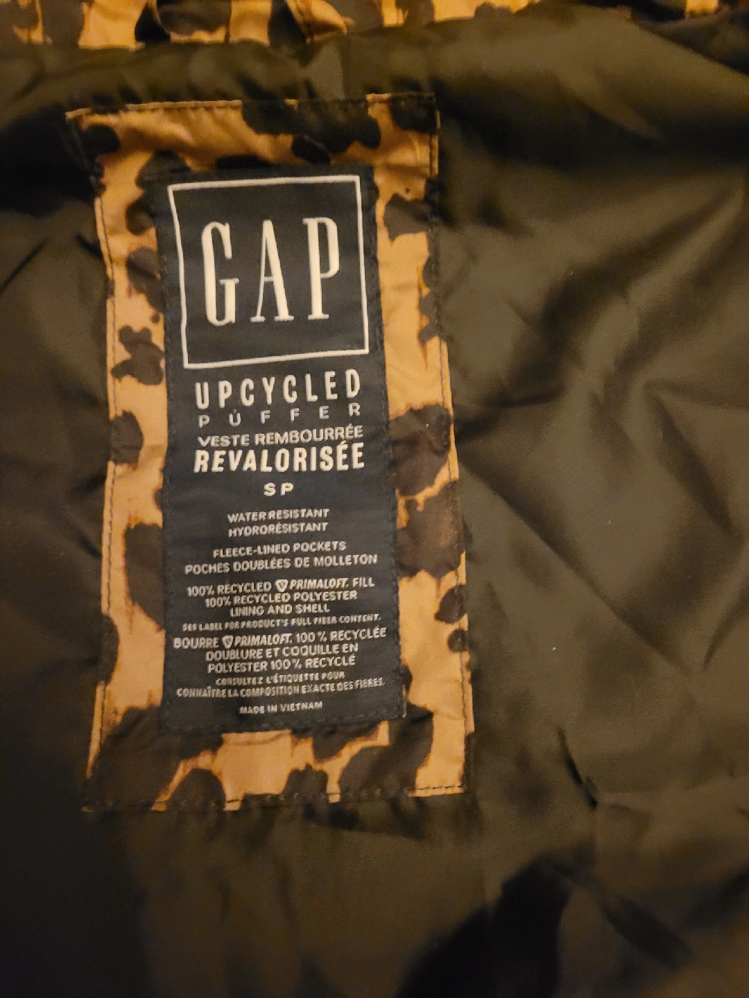 Keep cozy with this stylish GAP Upcycled Puffer Vest! It features a unique leopard print and is a size SP. The vest is water-resistant and has fleece-lined pockets for extra warmth. Made with 100% recycled polyester lining and shell. Perfect for layering!