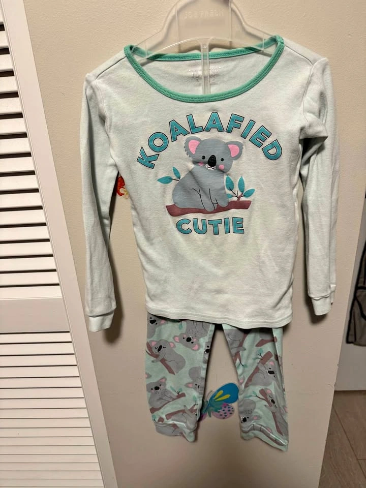 Teal long-sleeve top with koala graphic. Matching pants feature a repeating koala print.