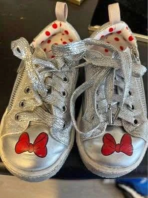 Silver glitter shoes. Red Minnie Mouse bows on toes. Red polka dot interior. Lace-up closure. Zipper detail.