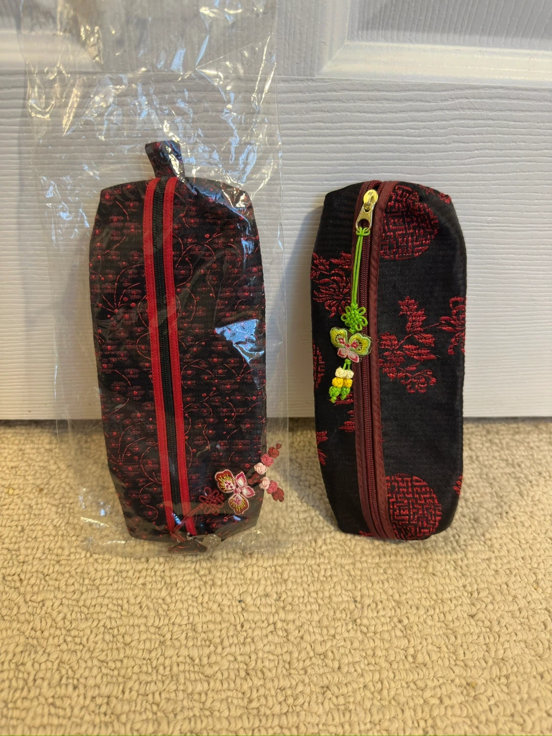 I have two handmade zippered pencil cases for sale. One is still in its original packaging! They both feature a lovely floral design in black and red. the one on the left is brand new ($10) and the one on the right is like new ($5)