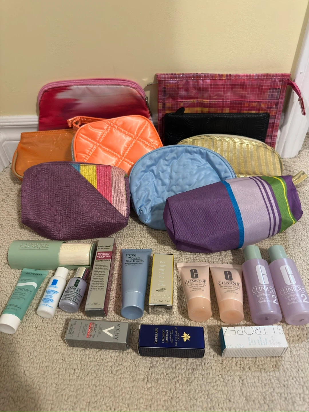 Selling a collection of assorted makeup bags and beauty products. Includes brands like Clinique, Biotherm, Strivectin-AR, Estee Lauder, Prevage, Vichy, Guerlain, and St. Tropez. Perfect for organizing your cosmetics or trying out new skincare items! one makeup bag + 1 beauty sample = $10