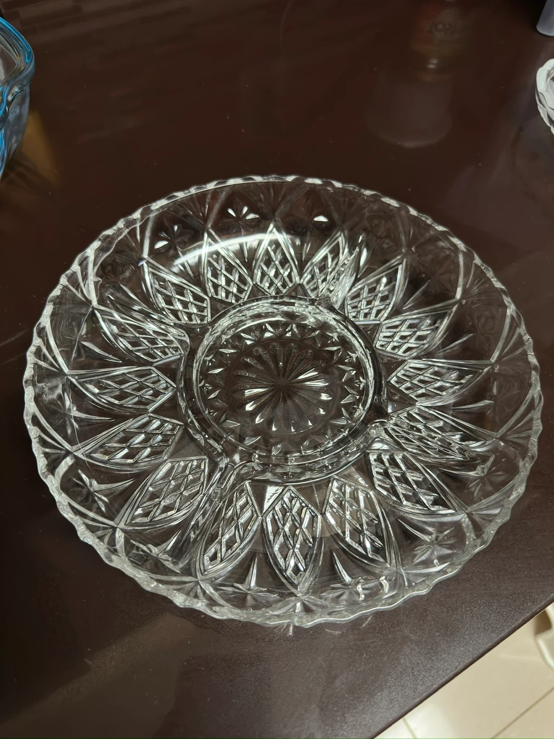 Selling a beautiful crystal glass serving platter! It features a lovely floral design and a central compartment, perfect for serving appetizers or snacks at your next gathering. The platter is in great condition and ready to add a touch of elegance to your table.